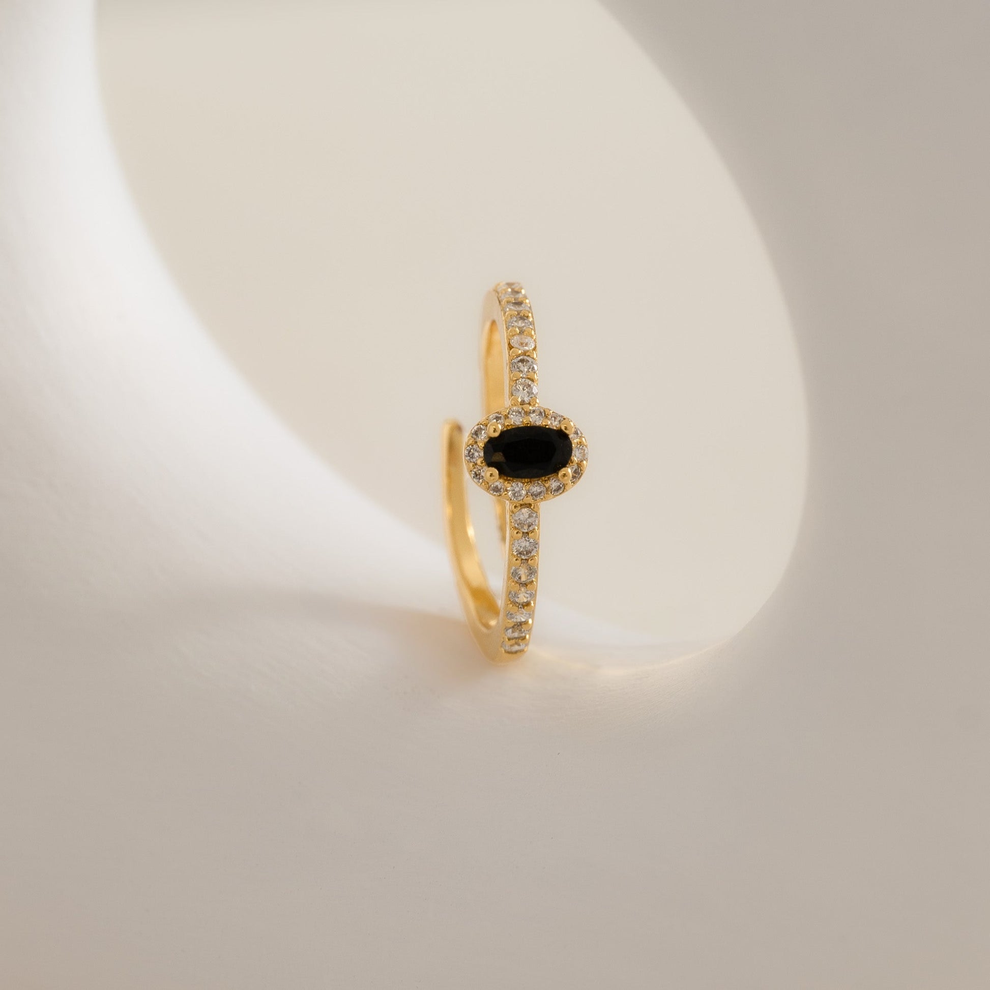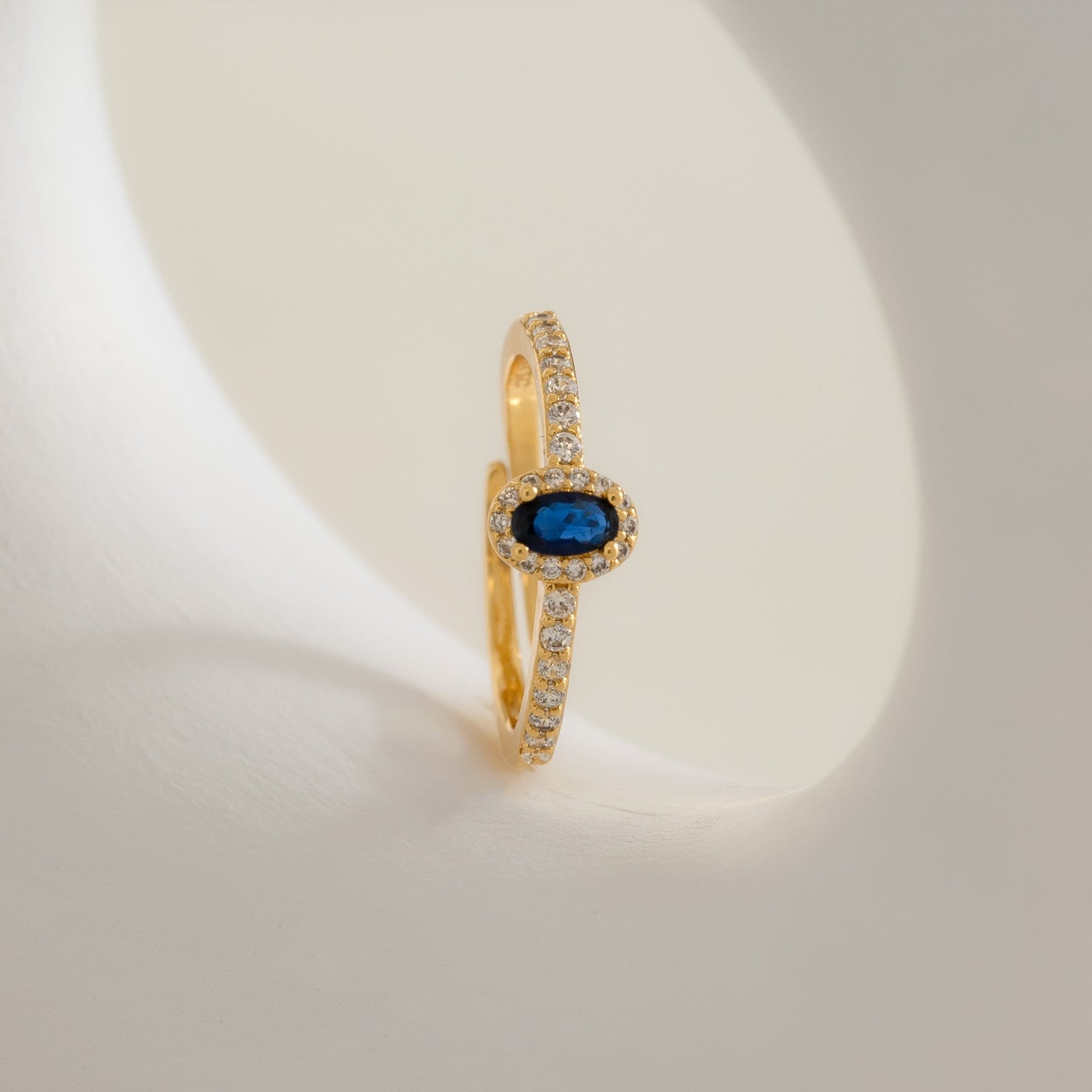 Elegancia que se distingue. Este es un anillo ajustable que combina el brillo intenso del oro laminado 18k con una piedra Circon central de corte oval, rodeada de mini circones que aportan destellos únicos. Disponible en cinco tonos que se adaptan a tu estilo y energía: zafiro azul, circón blanco, rubí rojo, esmeralda verde y ónix negro. Su diseño atemporal lo convierte en una pieza clave para elevar cualquier look.