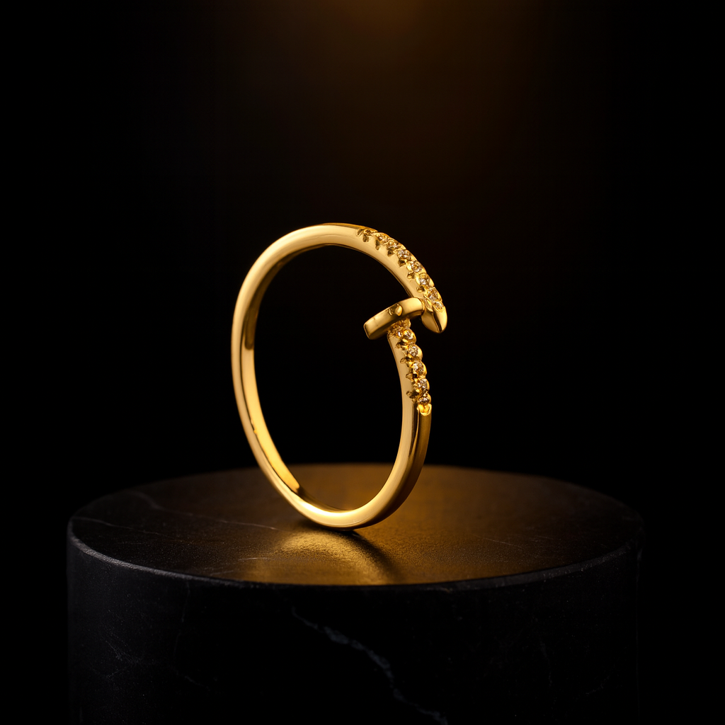 El anillo en forma de clavo transforma un elemento industrial en una pieza de alta joyería, perfecta para quienes aman romper reglas con estilo. El oro laminado 18K y las circonias aportan un brillo sofisticado que realza su forma única.