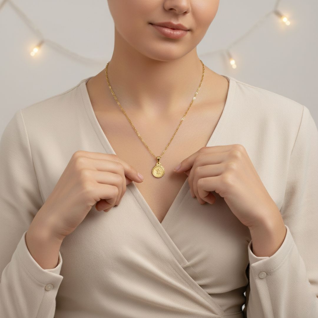 Hermosa cadena fígaro 3x1 con destellos, perfecta para complementar cualquier look. Incluye un dije de medalla de San Miguel Arcángel que trae una poderosa oración en su reverso. Protección y estilo en una sola pieza.