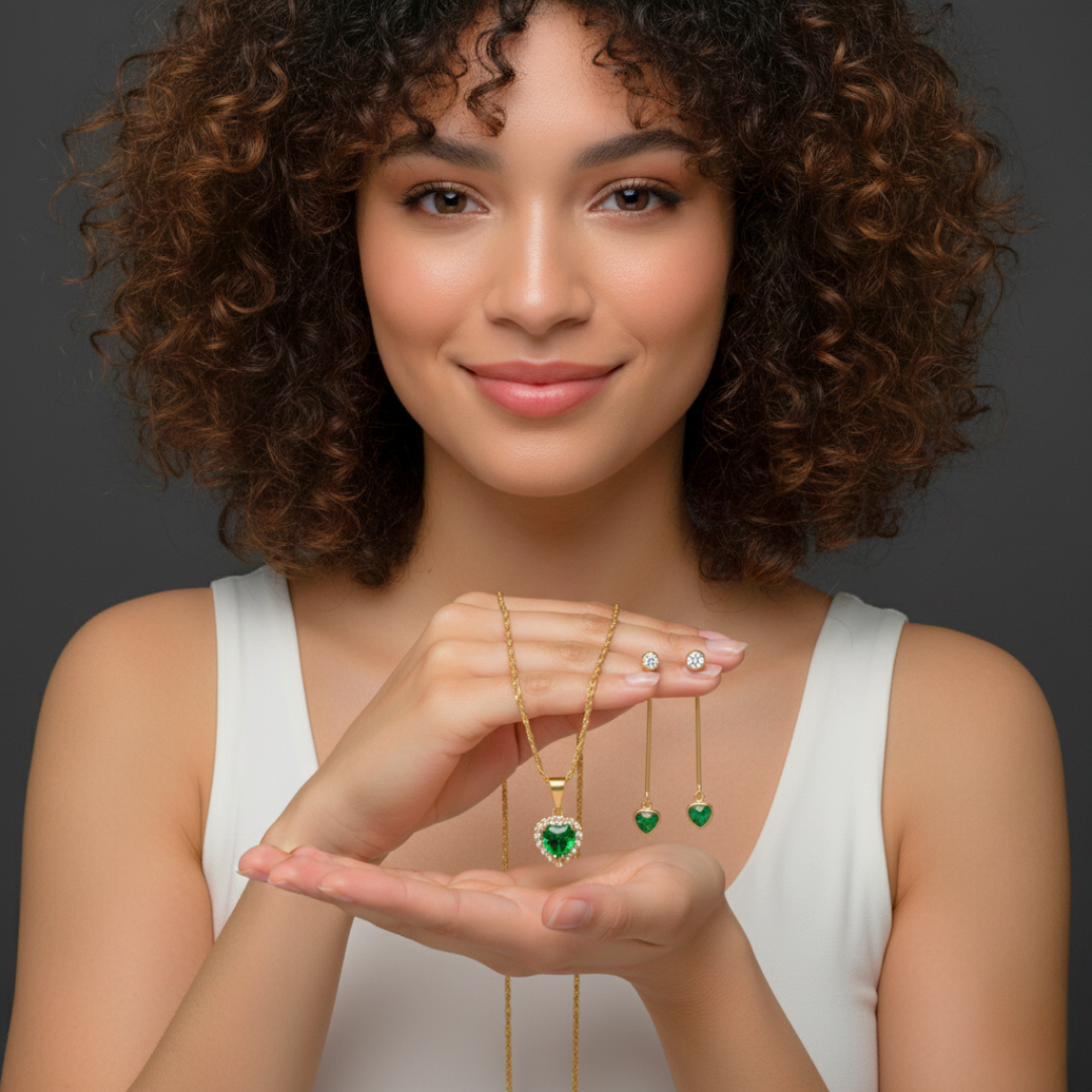Este conjunto es para quienes aman destacar con elegancia y un toque vibrante. El corazón verde simboliza amor, esperanza y renovación — todo envuelto en un diseño radiante de oro laminado 18K. Es esa chispa que transforma cualquier look en una declaración de estilo. 🌟