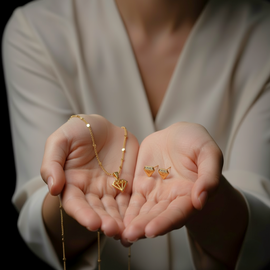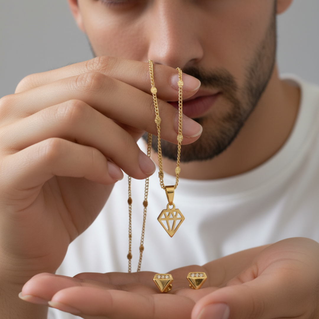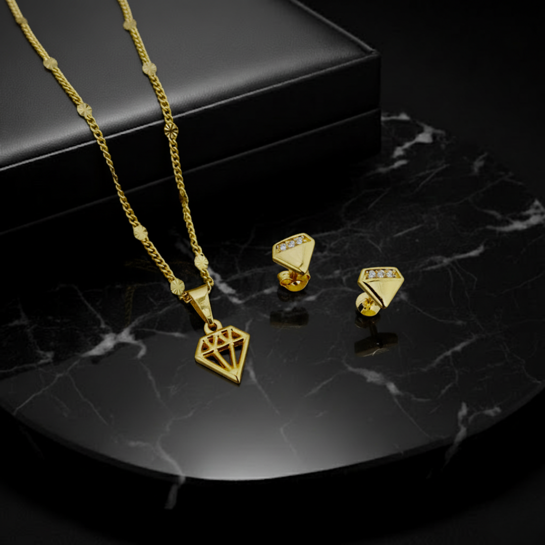 Este conjunto está diseñado para quienes entienden que la elegancia no tiene género, sino actitud. Su dije geométrico y topitos en forma de diamante reflejan una energía moderna y poderosa, mientras la cadena en oro laminado 18K envuelve tu estilo con confianza y sofisticación. ✨