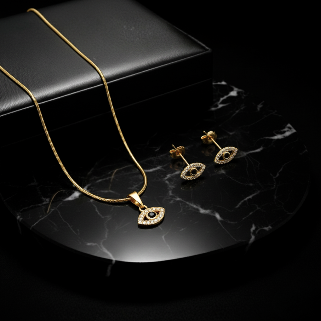 Luce radiante y protegida con este elegante conjunto ✨ Su diseño con cadena serpiente o “cola de ratón” aporta un brillo sutil que se complementa a la perfección con el poderoso símbolo del ojo turco. Este set no solo es hermoso, también es un amuleto lleno de significado que te acompaña día a día 💫