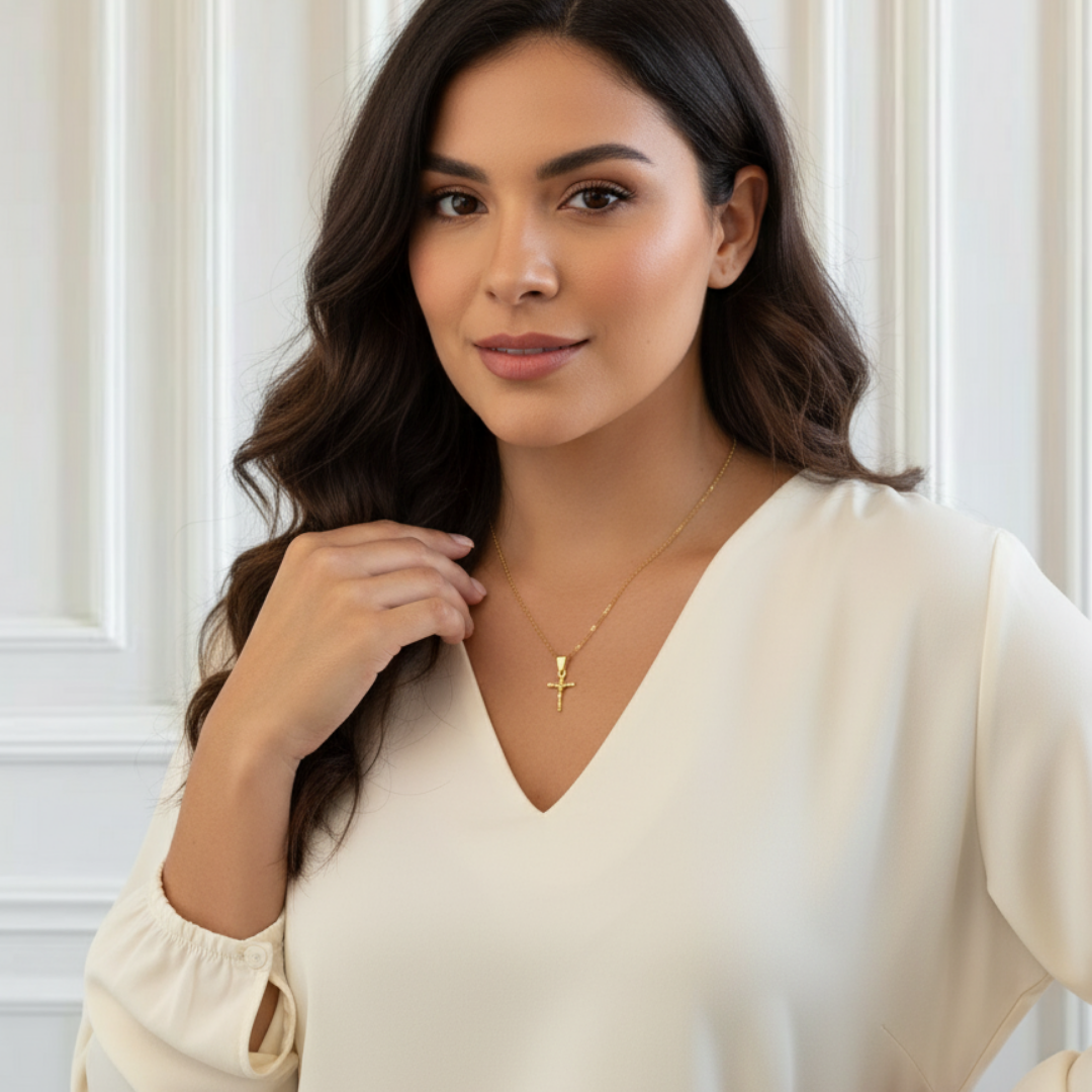 Su tamaño pequeño lo hace ideal para quienes prefieren un look más sutil, sin dejar de lado la profundidad y poder simbólico de la cruz.