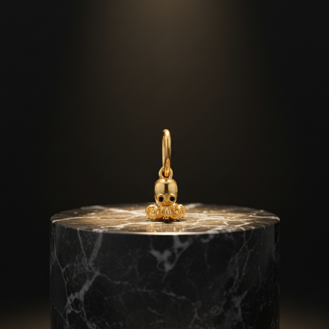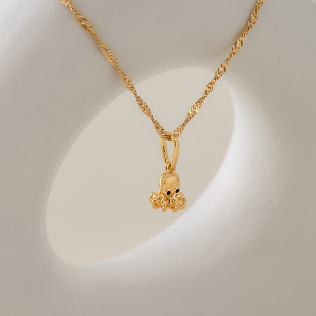 Inspirado en el famoso Pulpo Paul, símbolo de intuición y misterio, este dije en oro laminado es ideal para quienes confían en su instinto y no temen destacar.