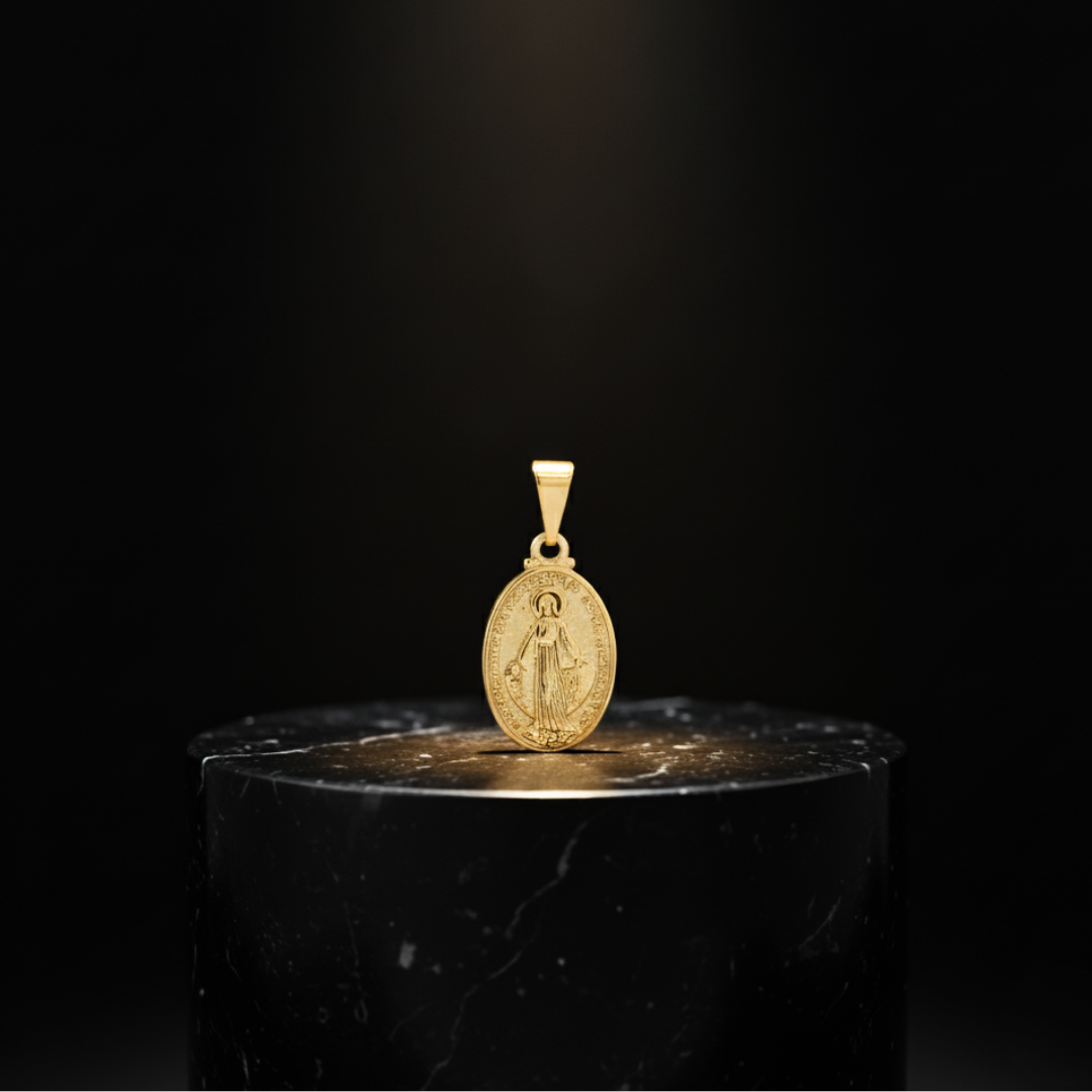 La figura de la Virgen Milagrosa está finamente tallada en una medalla dorada, para llevar siempre contigo una luz de esperanza 🙏