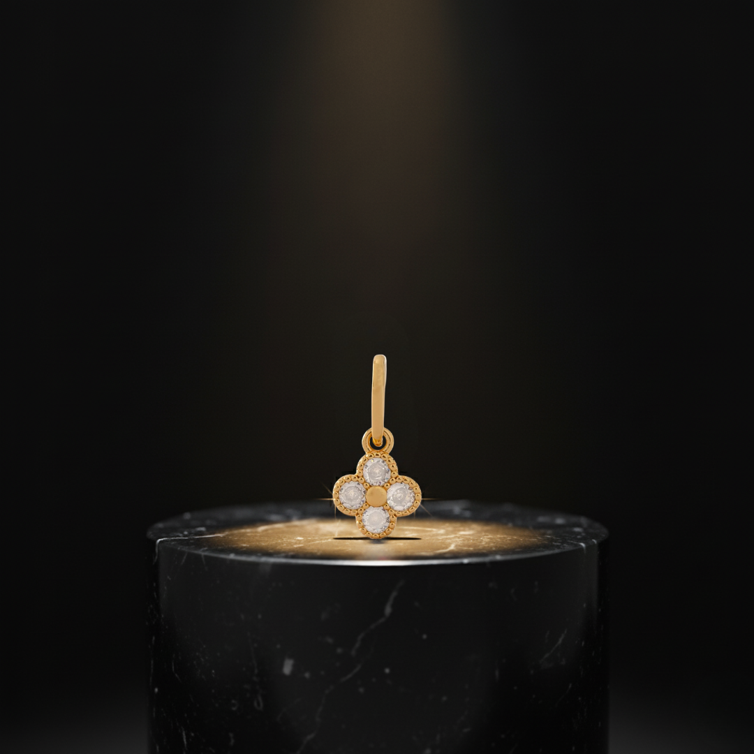 Un diseño inspirado en la estética clásica de la alta joyería, reinterpretado en una pieza pequeña pero impactante. Este dije evoca suerte, protección y armonía, con un toque sofisticado gracias a sus circonias que capturan la luz con cada movimiento.