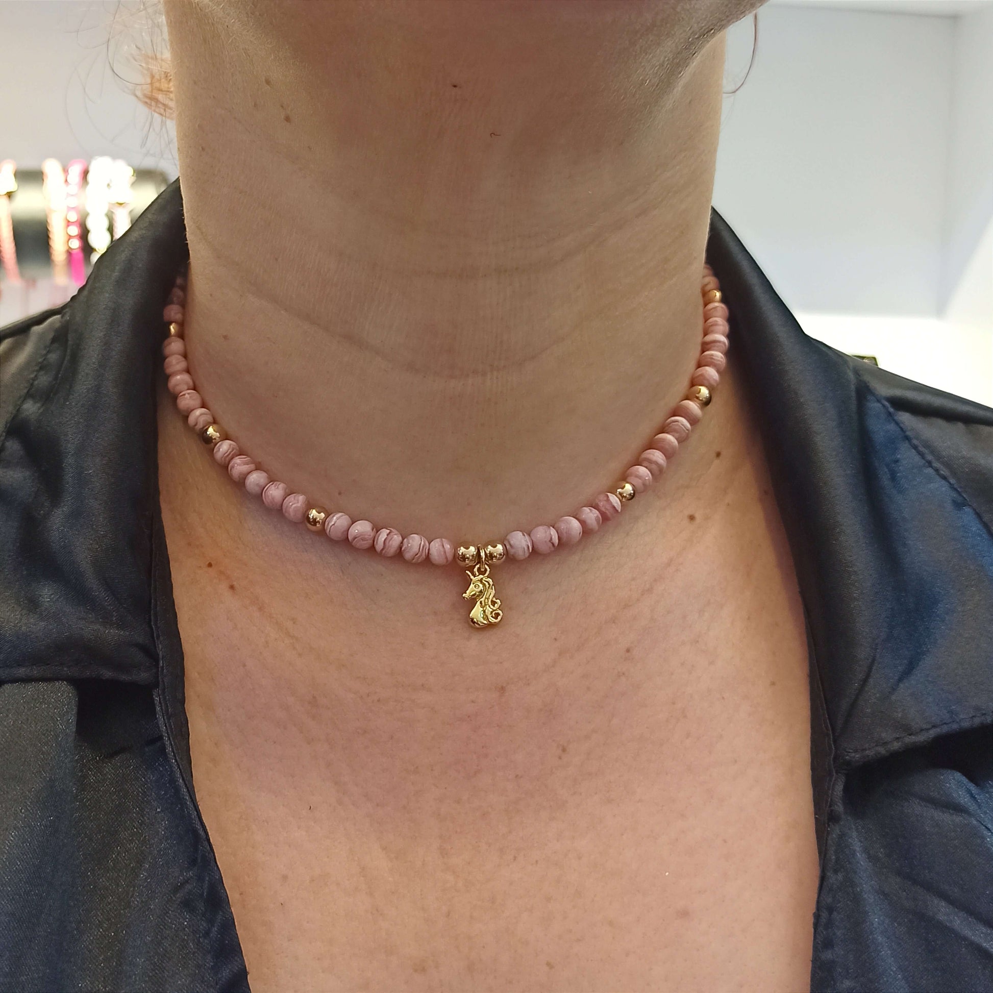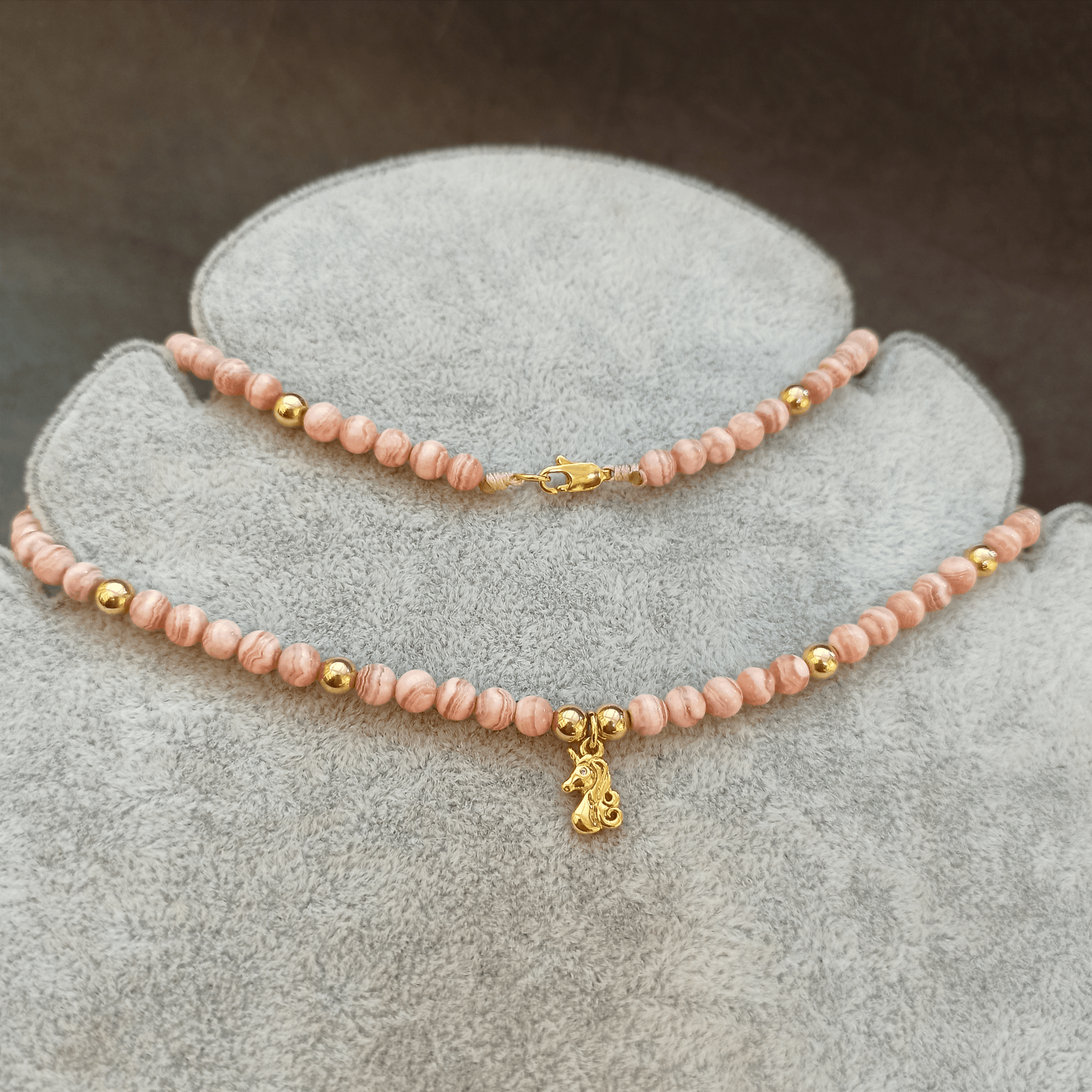 No dejes pasar la oportunidad de adquirir esta magnífica gargantilla con dije de unicornio y balines en oro laminado combinada rodocrosita. Es una inversión en tu belleza y tu bienestar, un recordatorio de que la magia y la belleza están siempre presentes en tu vida. Lleva contigo este símbolo de gracia y encanto y deja que te inspire a perseguir tus sueños con valentía y alegría.