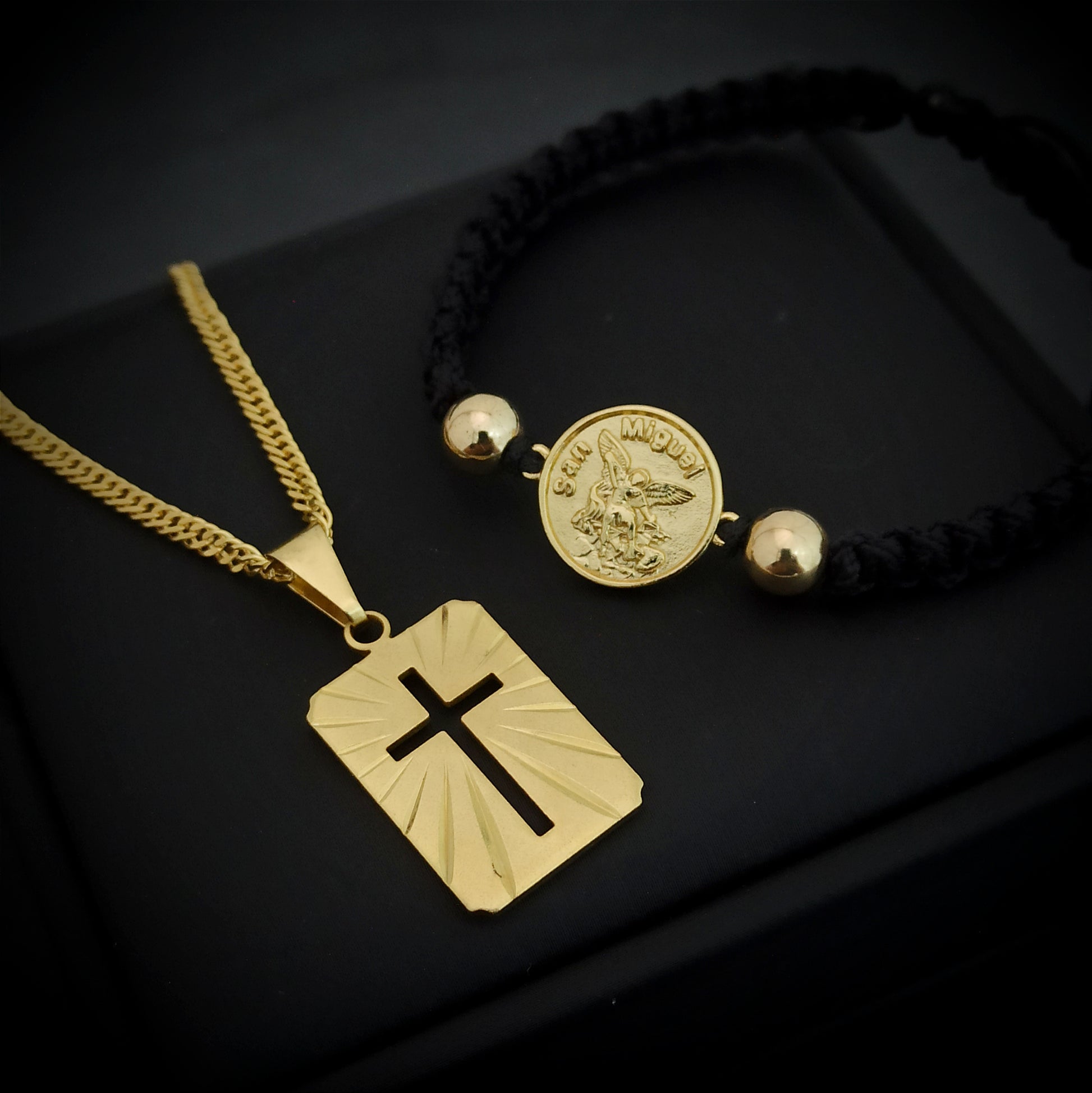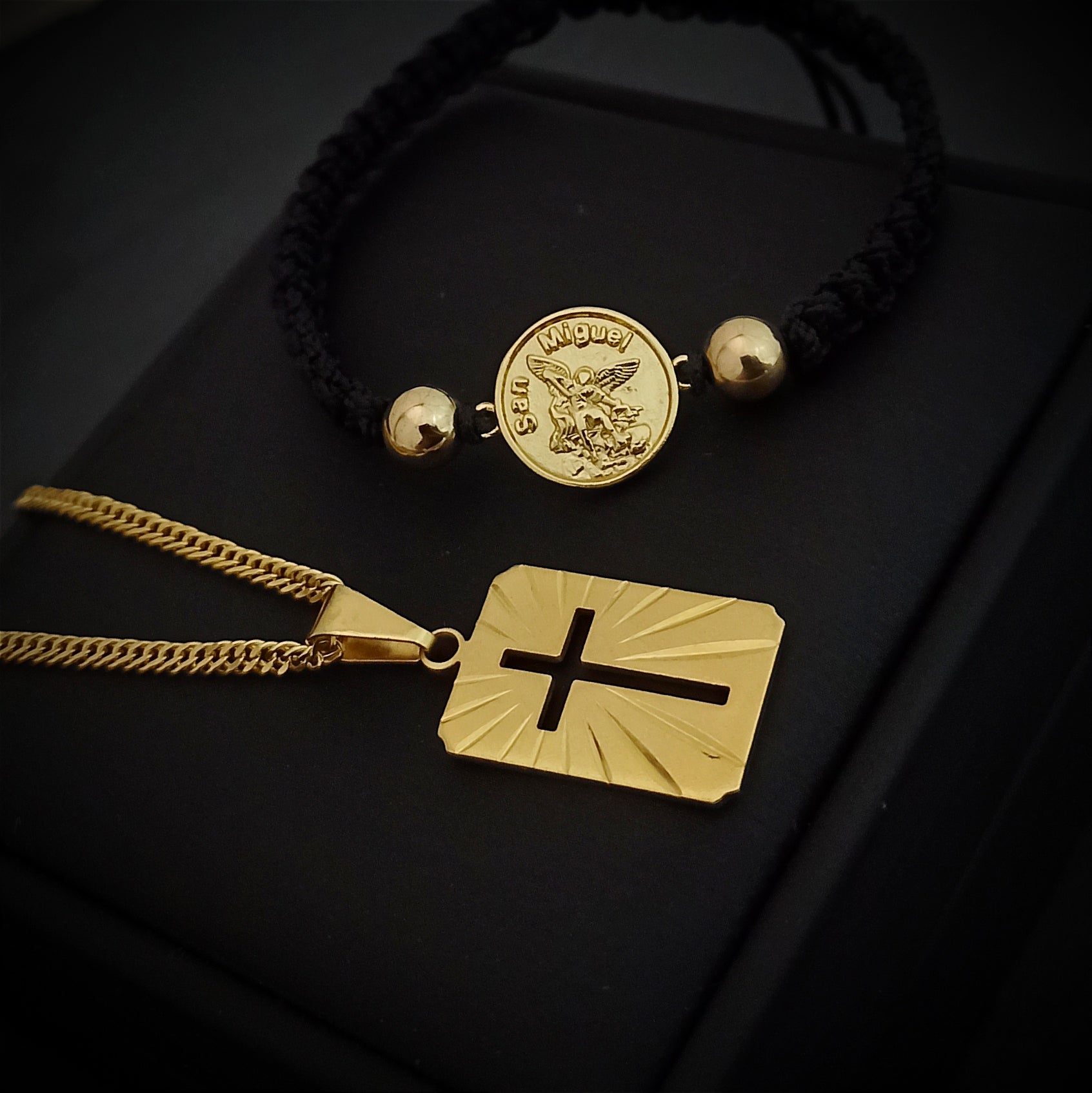Usted elige este conjunto porque entiende que los símbolos poderosos son los únicos que realmente definen a un líder. Portar la Cruz y el Arcángel es decidir que su día estará marcado por la protección y la claridad. Es un reconocimiento a la nobleza de quien lo usa y la firma personal de alguien que sabe exactamente cuánto vale lo que protege.
