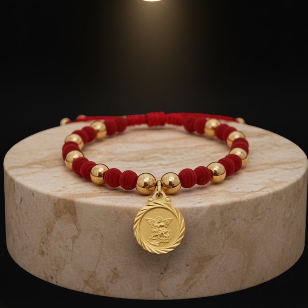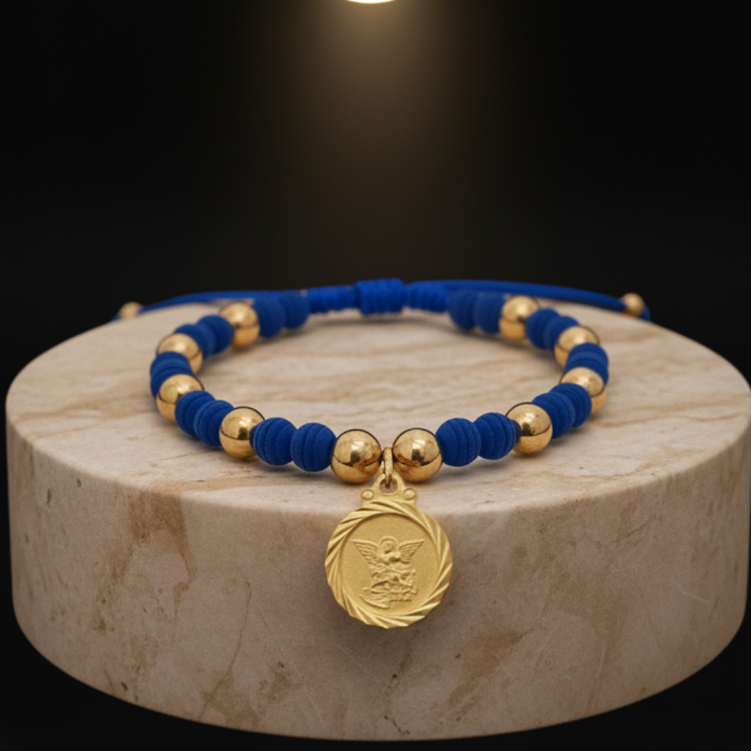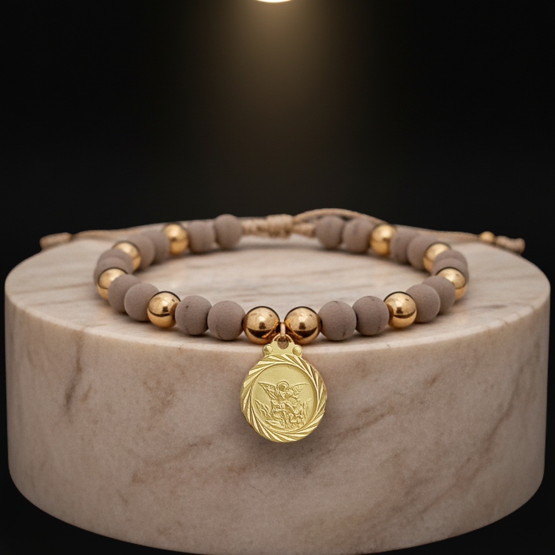 ¡Consigue la protección y el estilo con nuestra Manilla Arcángel San Miguel intercalo - MNL23210! Hecha a mano con balines en oro laminado 18k y neoprenos lisos, esta hermosa manilla también cuenta con un dije de San Miguel Arcángel para brindar protección a quien la use.