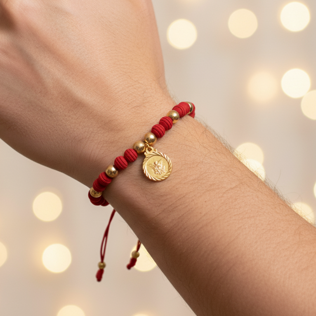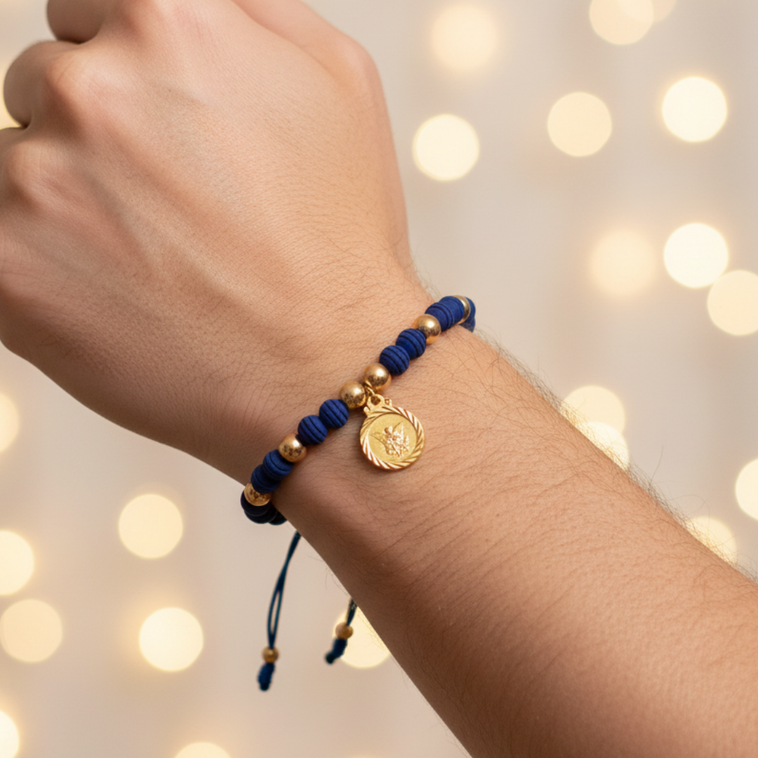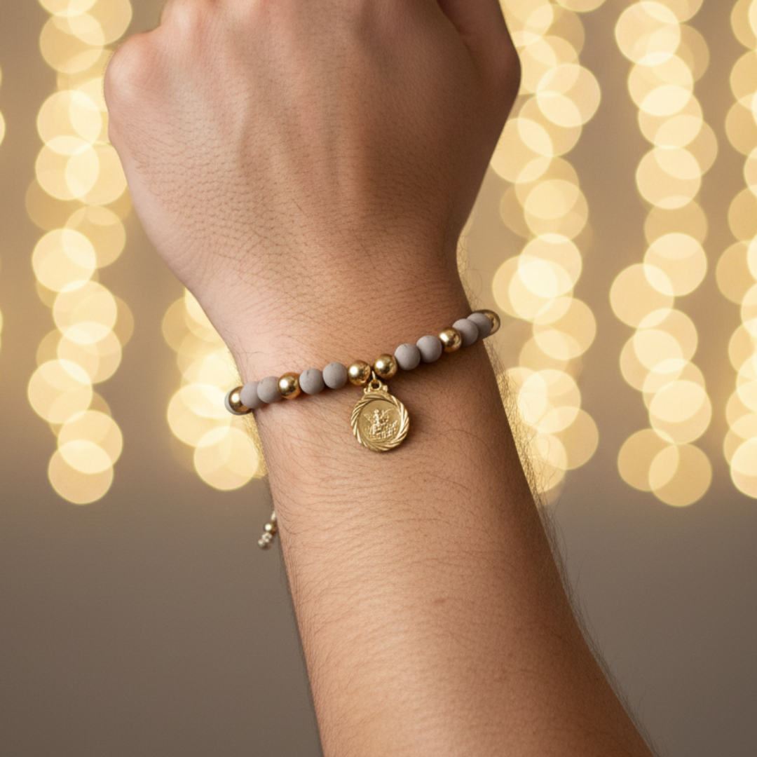 ¡Consigue la protección y el estilo con nuestra Manilla Arcángel San Miguel intercalo - MNL23210! Hecha a mano con balines en oro laminado 18k y neoprenos lisos, esta hermosa manilla también cuenta con un dije de San Miguel Arcángel para brindar protección a quien la use.
