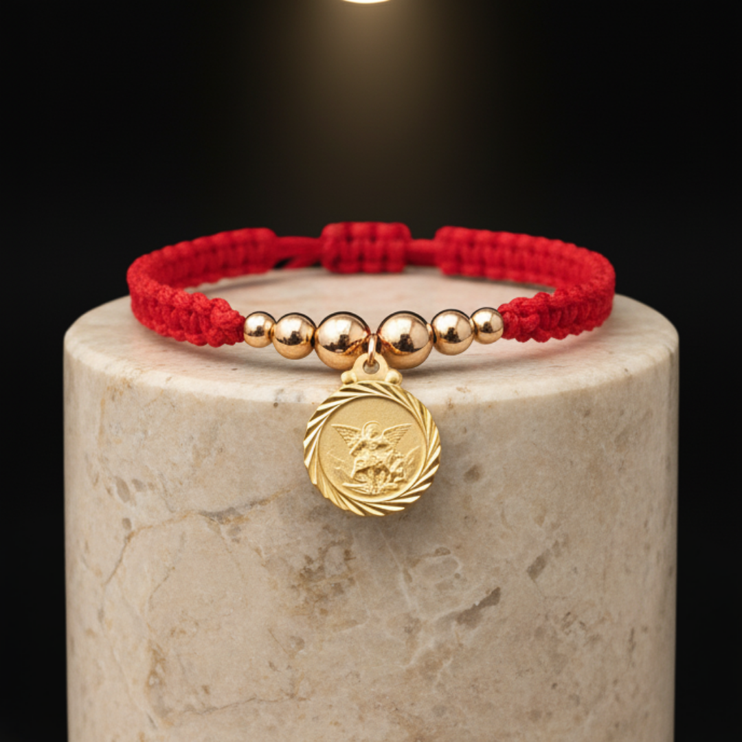 Esta preciosa manilla hecha a mano con balines y un dije de san miguel arcángel diamantado en oro laminado no solo te ayudará a protegerte contra las energías negativas, sino que también te dará un toque elegante y sofisticado. Emprende tu día con la protección y la belleza de esta manilla celestial.
