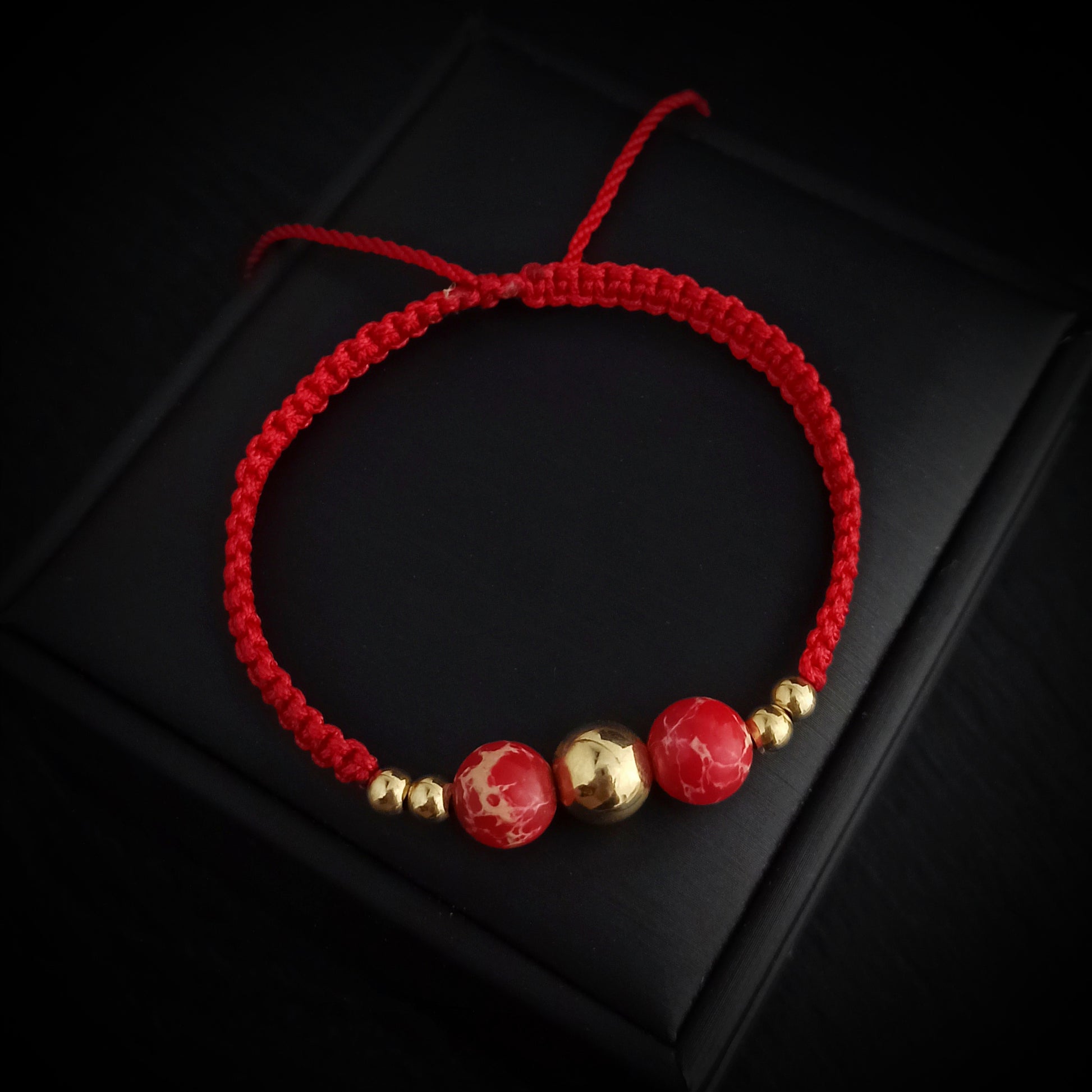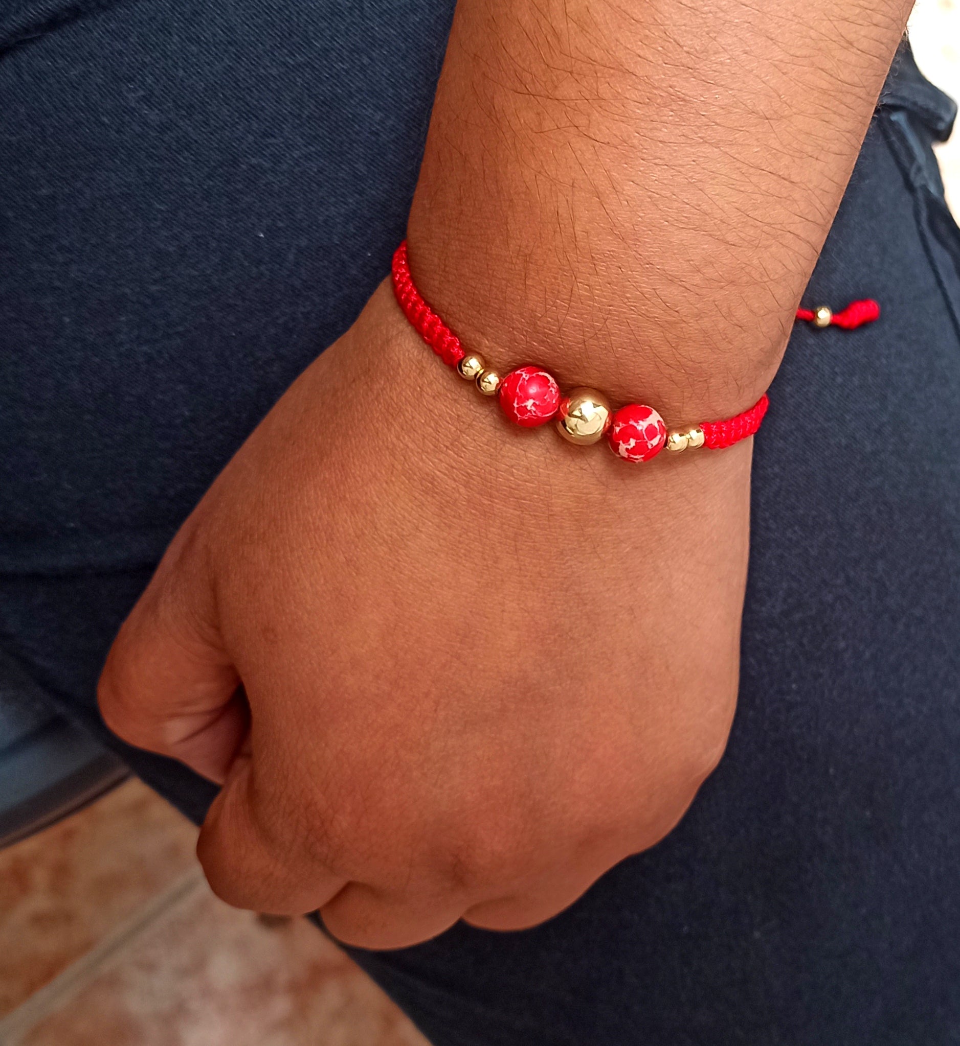 ¡Equilibra y activa tu chakra raíz! Con esta manilla hecha a mano con balines en oro laminado y piedra natural, esta manilla te ayudará a conectarte con tu energía y sentir una sensación de estabilidad y seguridad. ¡Lleva contigo esta poderosa herramienta para mejorar tu bienestar!