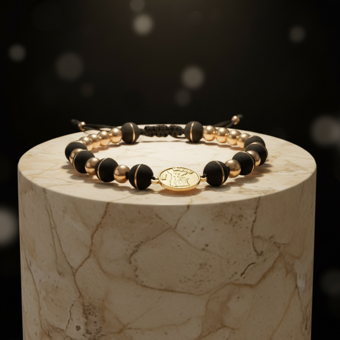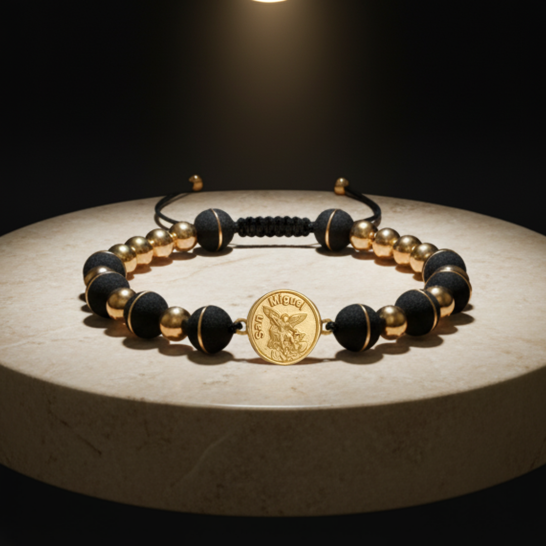 Una manilla que fusiona la fuerza espiritual de San Miguel Arcángel con la textura distintiva del neopreno argollado, resaltado por los brillantes balines en oro laminado, creando un estilo único y significativo.