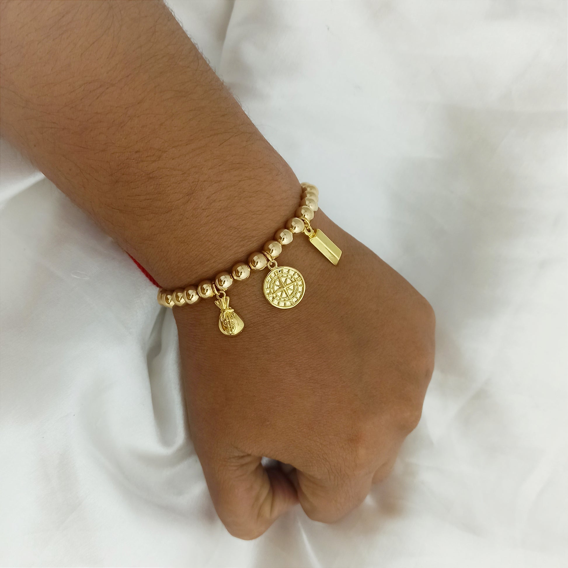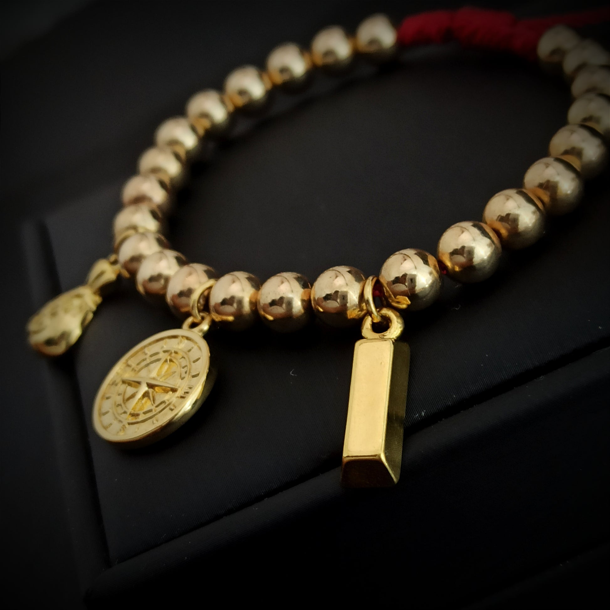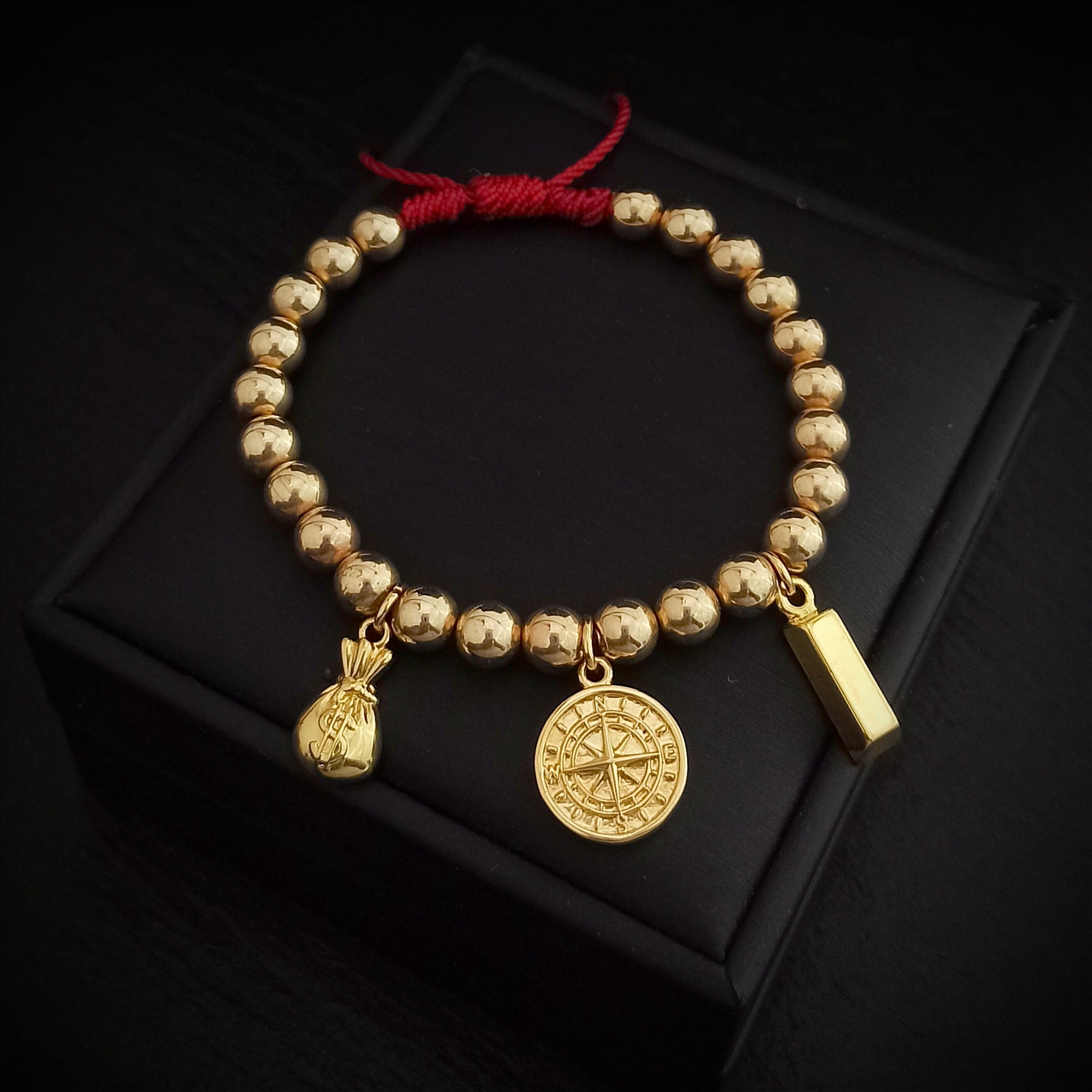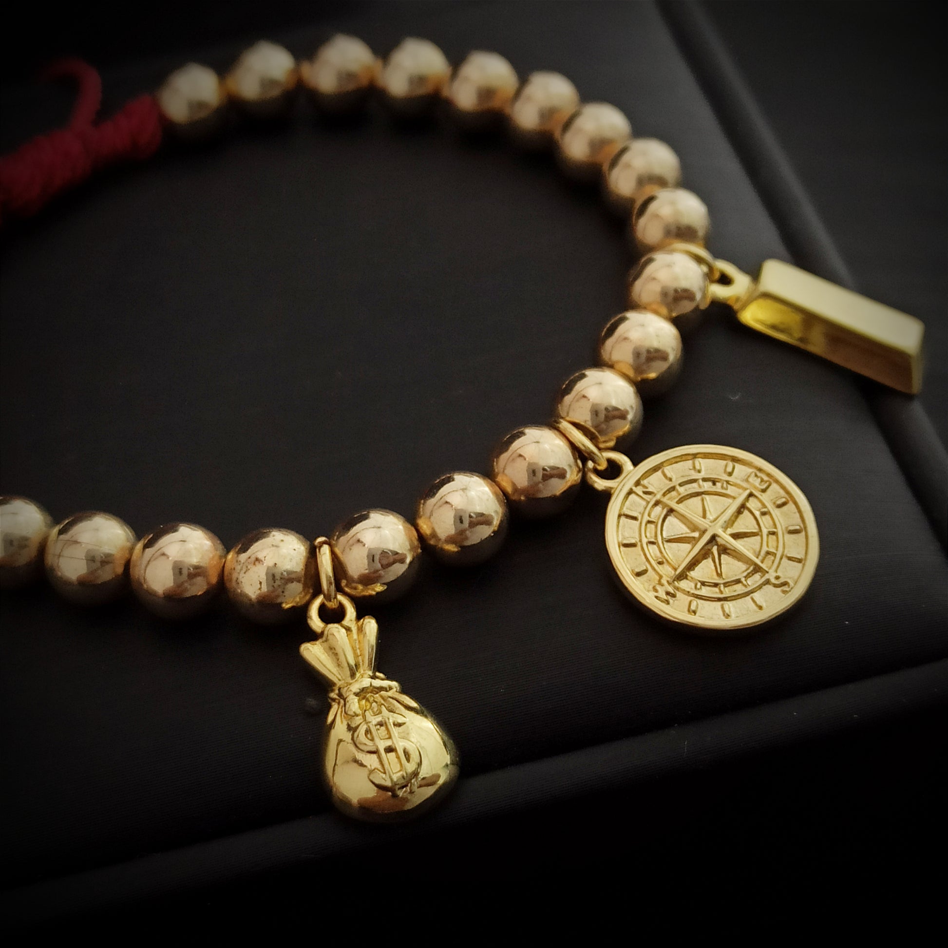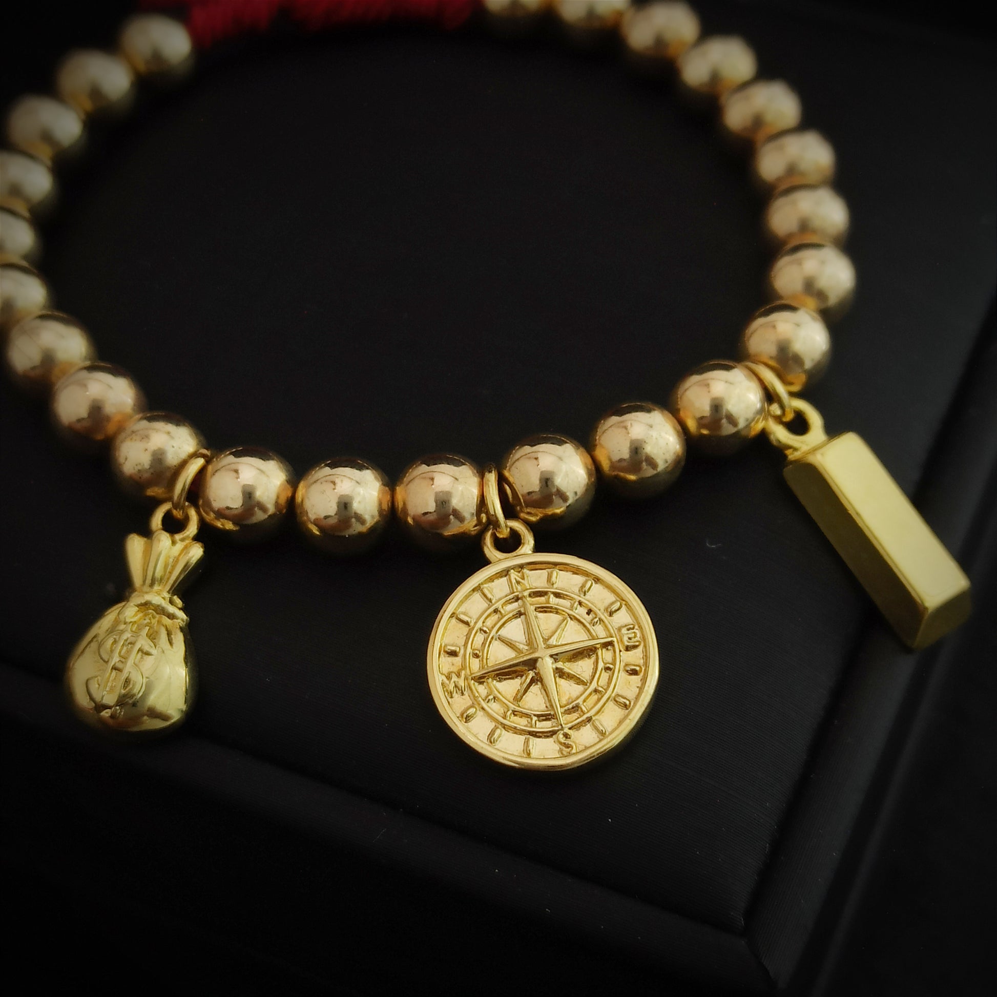 Una Manilla con propósito y significado. Esta manilla no solo adorna tu muñeca, sino que también cuenta una historia: la bolsa de dinero y el lingote simbolizan prosperidad 💵, mientras que el dije de brújula te inspira a mantener el rumbo hacia tus metas 🌟. Hecha en oro laminado 18k, es perfecta para quienes valoran el estilo con intención.