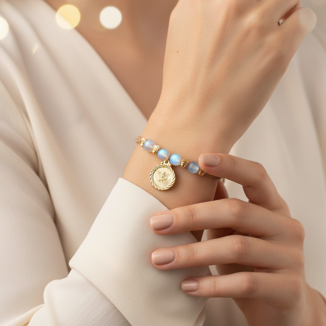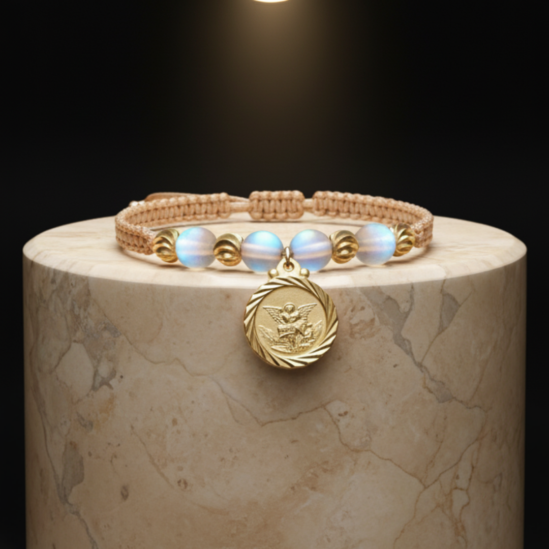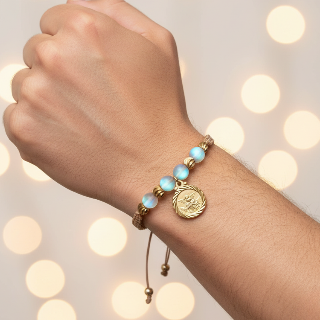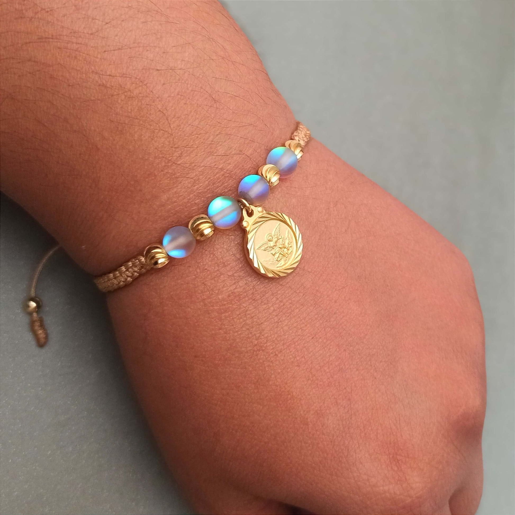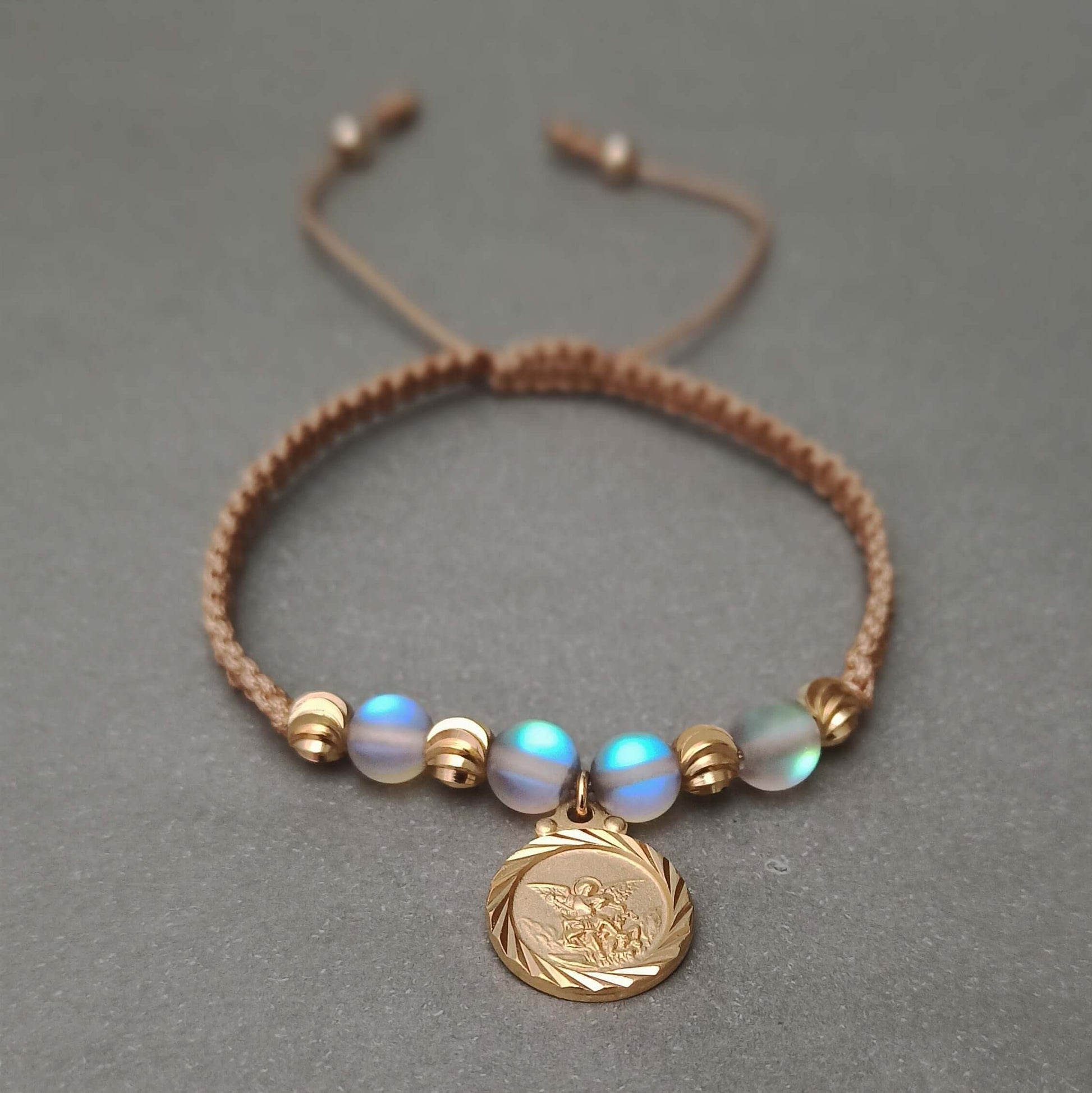 La Minalla Boreal combina la. Protección de nuestro Arcángel San Miguel con la magia y el misterio de la piedra luna. La cual le otorga una energía muy especial a esta manilla