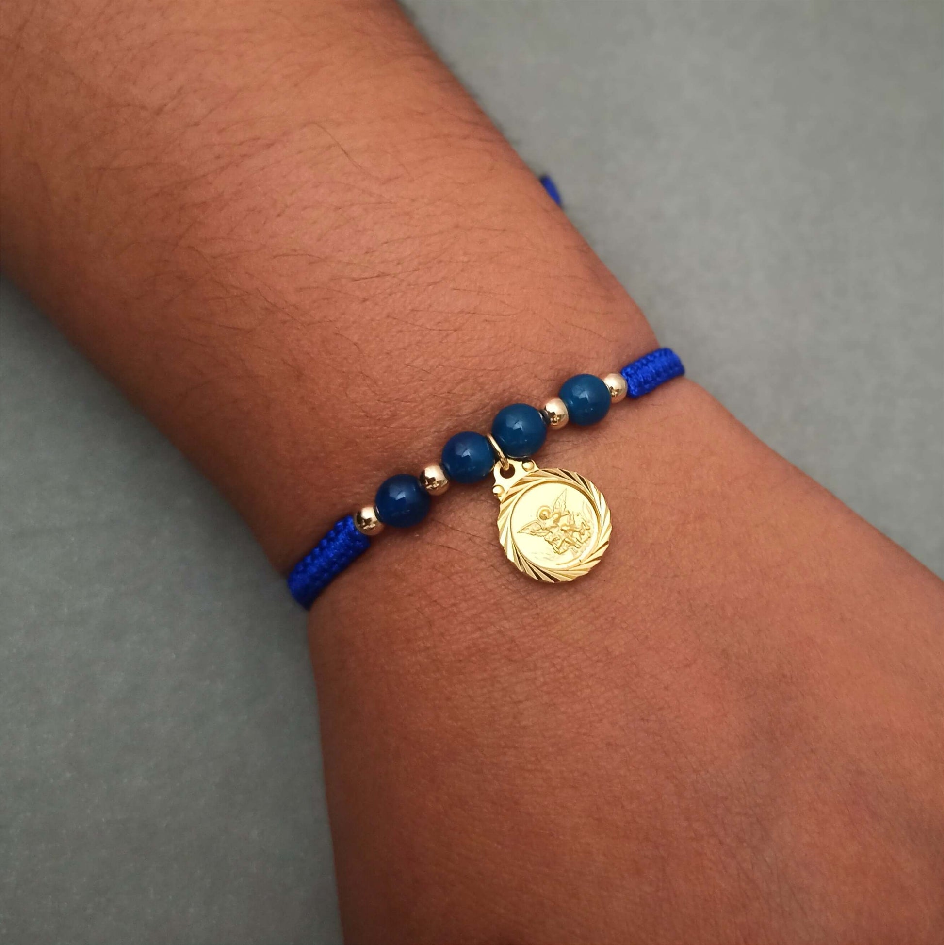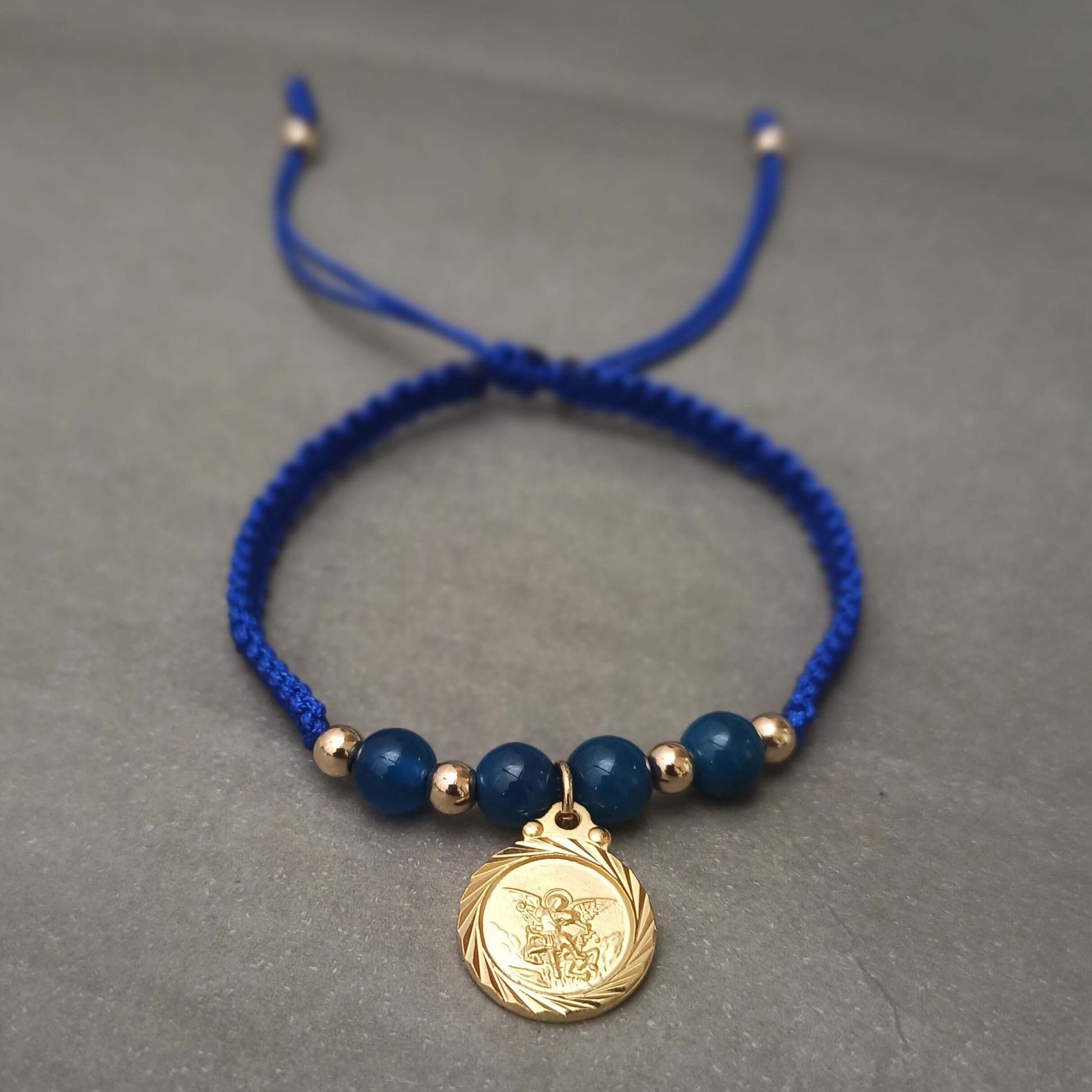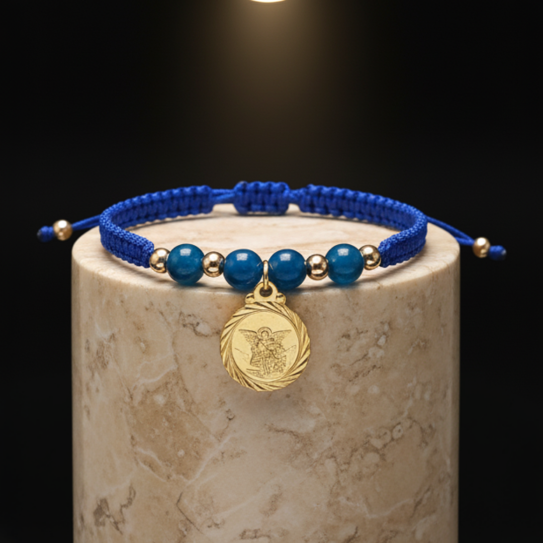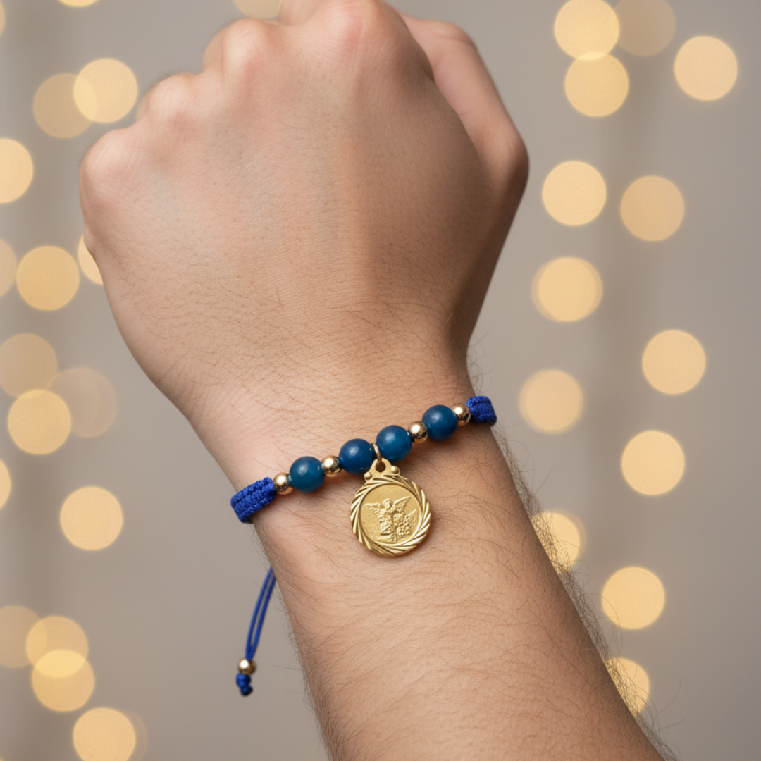 Esta hermosa manilla de San Miguel Arcángel con Ágata te proporcionará protección y energía positiva en tu día a día. El dije de San Miguel te dará fuerza y la piedra de Ágata azul te brindará tranquilidad y armonía. Llévala contigo siempre para sentir su poderoso efecto persuasivo.