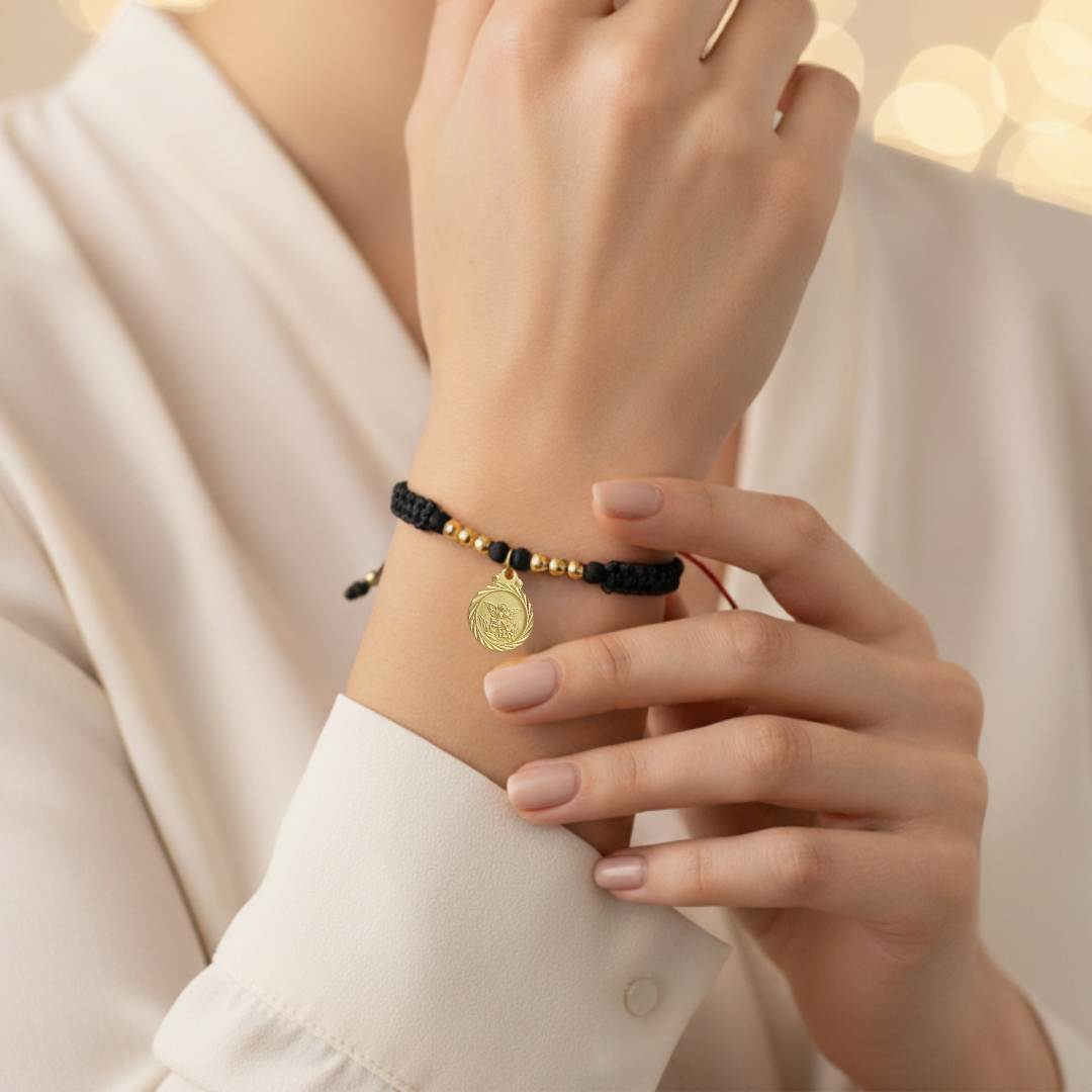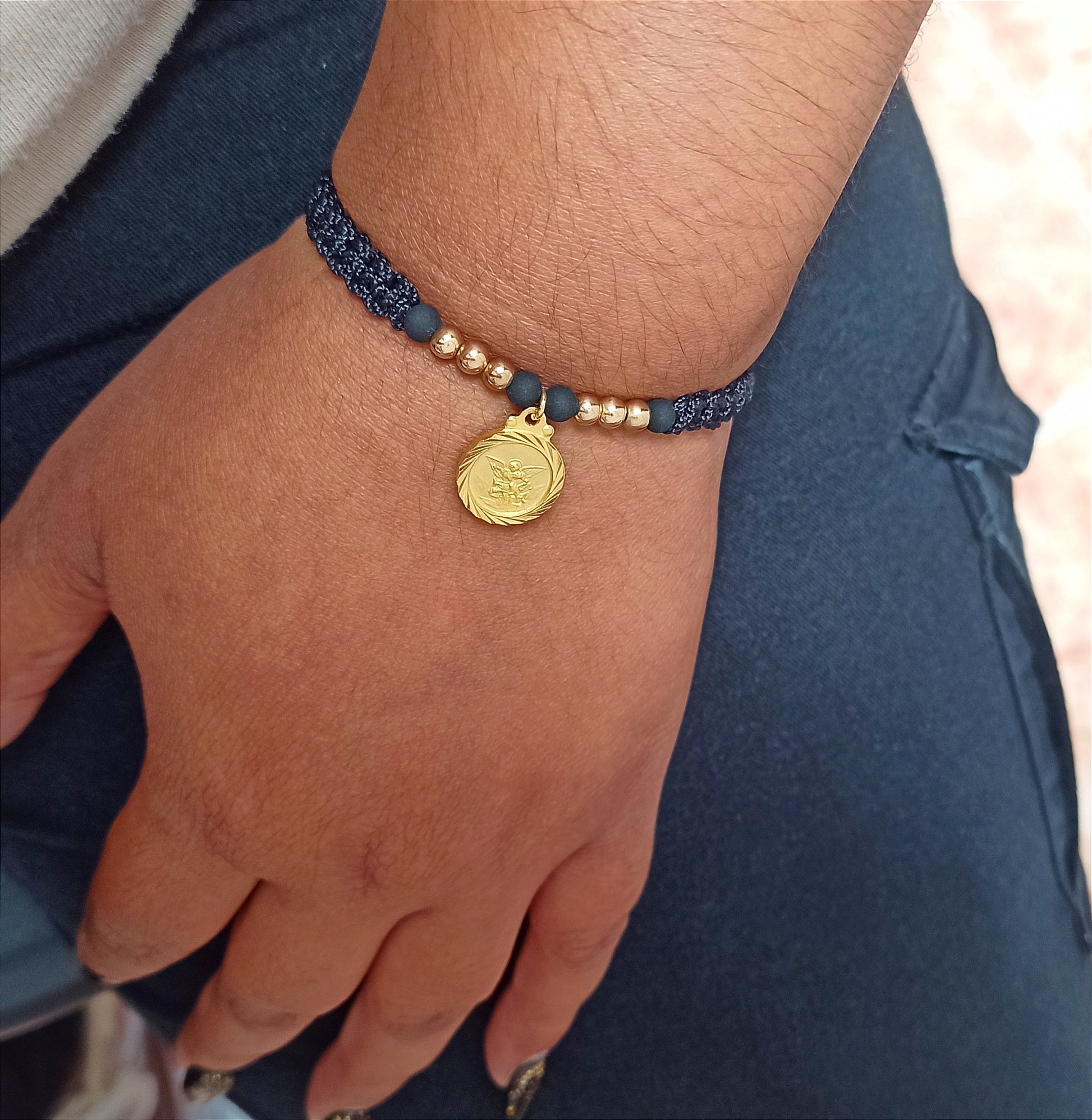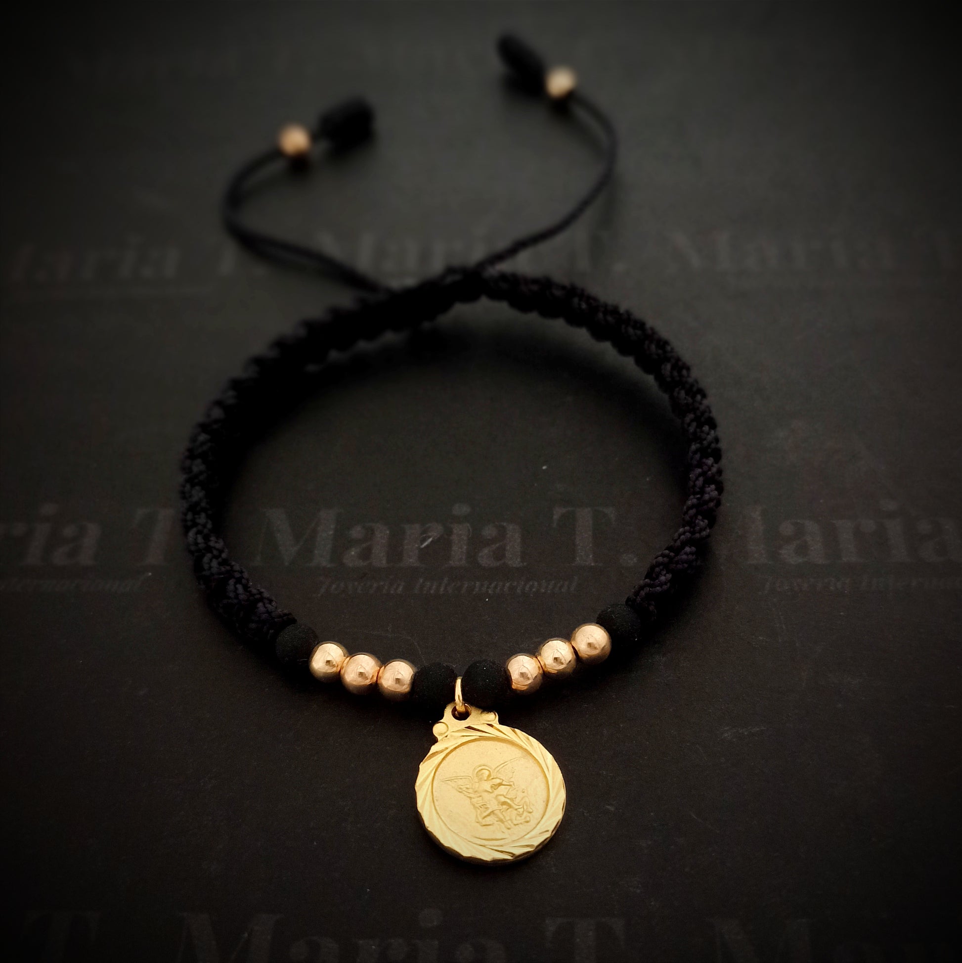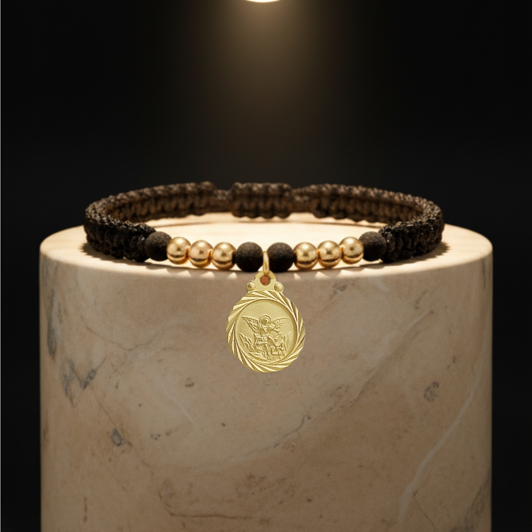 ¡Luce elegante y protegido con nuestra Manilla San Miguel Arcángel Diamantada! Hecha a mano con balines lisos y un dije en oro laminado, su diseño diamantado te hará destacar. ¡Siente la protección del arcángel en todo momento!