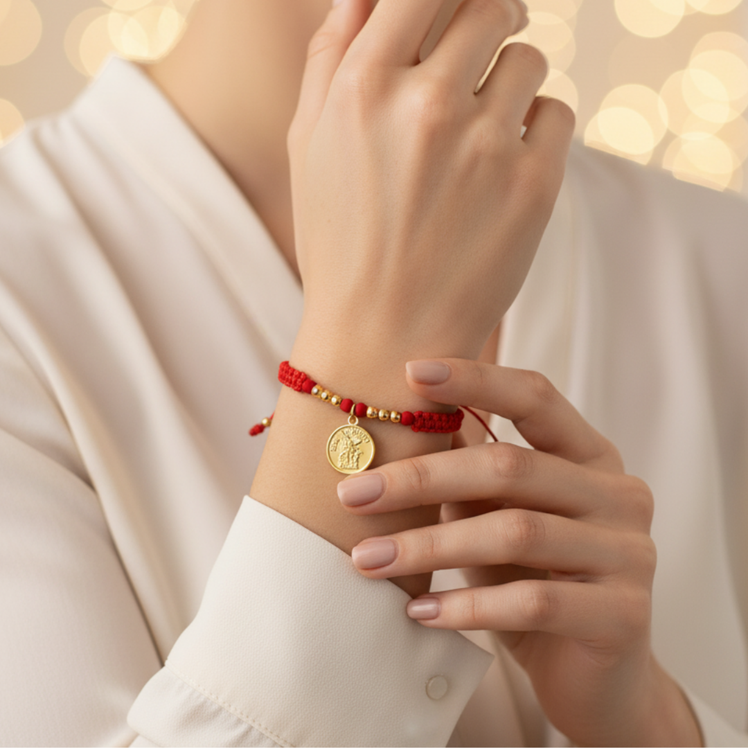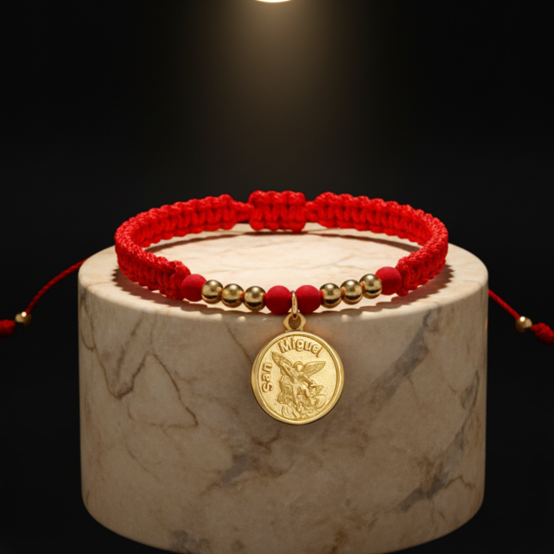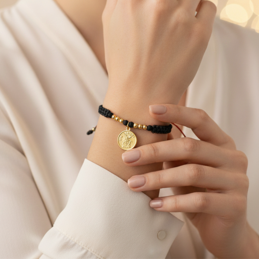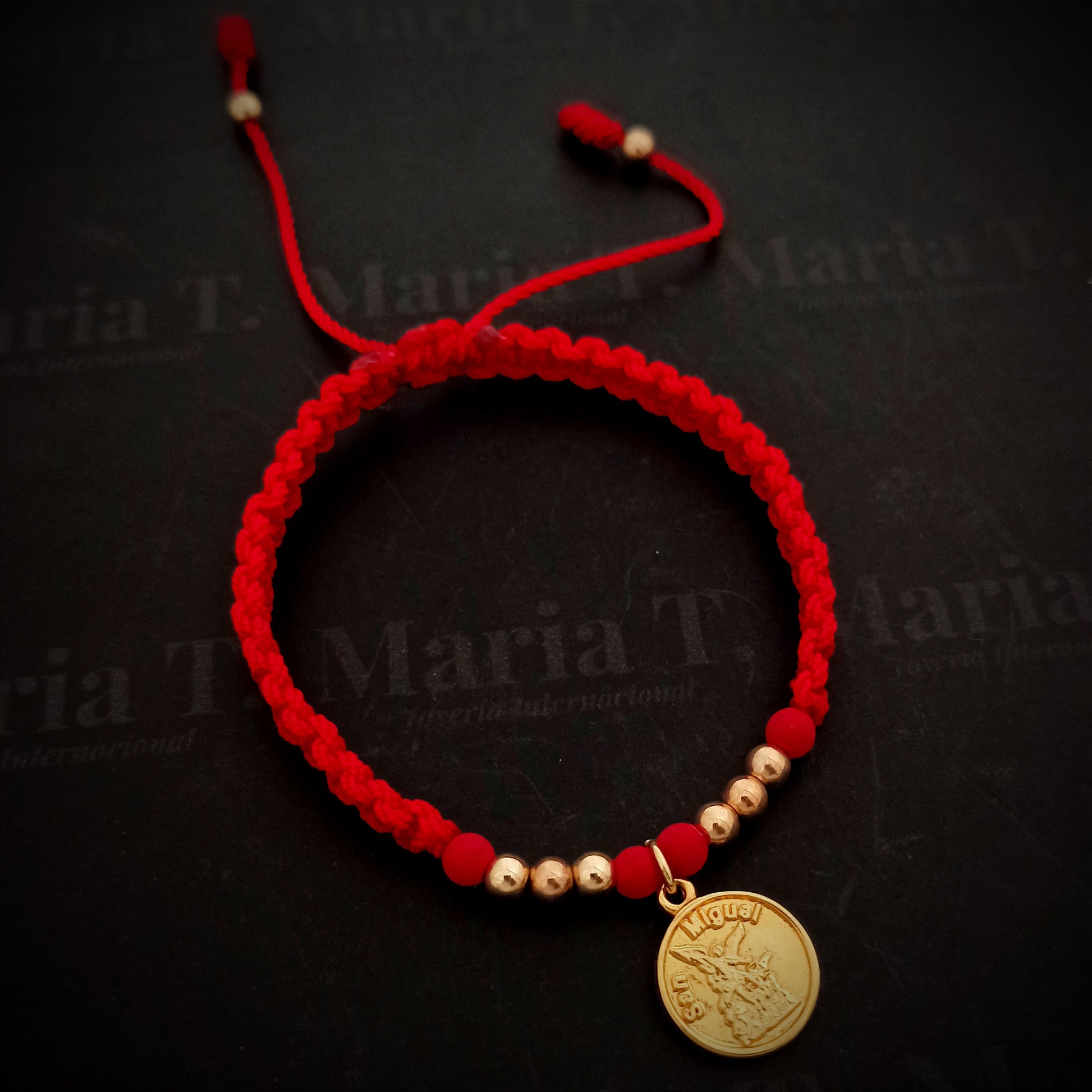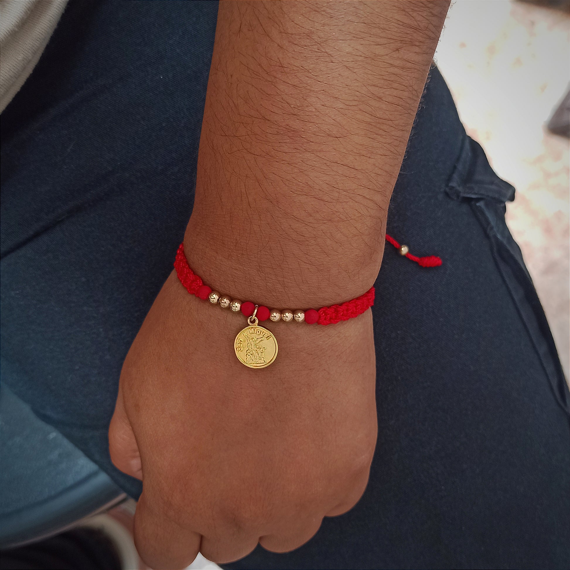 Luce esta hermosa manilla elaborada con balines de oro laminado de 18k y adornada con un dije de San Miguel Arcángel, símbolo de protección y valentía.