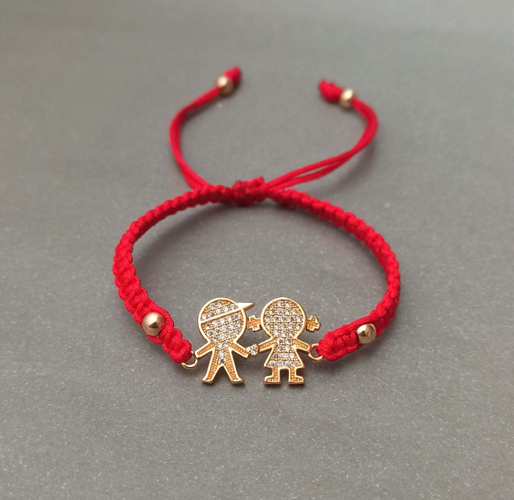 Esta manilla en color rojo destaca por su diseño único, incorporando balines y herrajes de niños agarrados de la mano elaborados en oro laminado. El color rojo simboliza la pasión y la fuerza, mientras que los niños entrelazados representan la unión, la conexión y la pureza.
