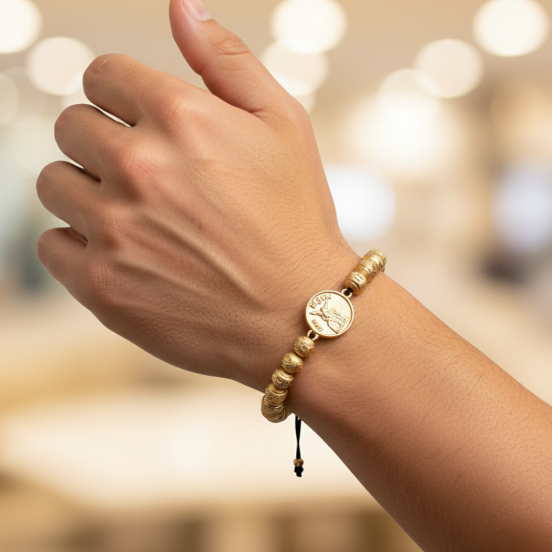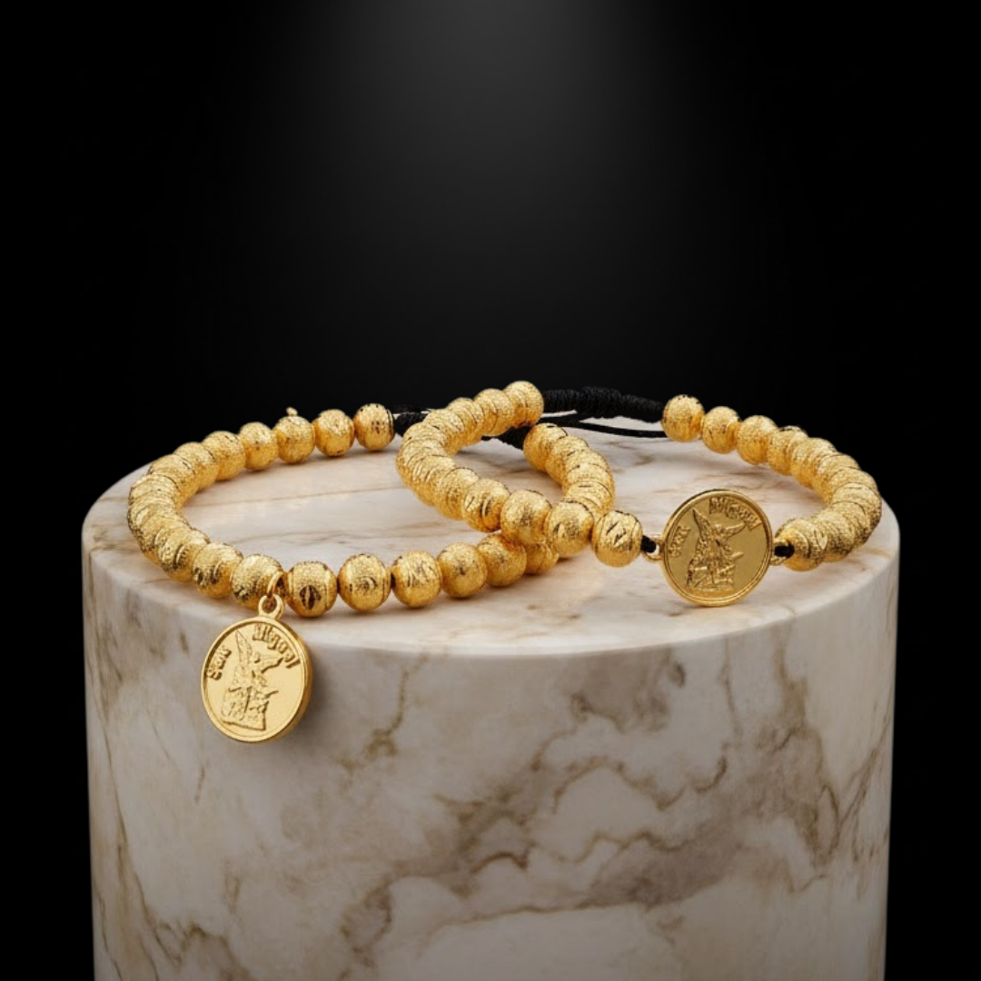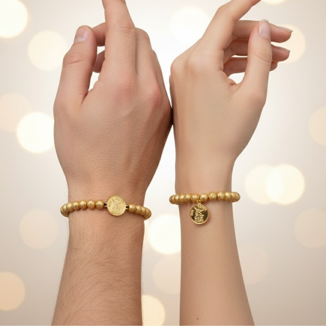 ¡Lleva la protección de San Miguel contigo con estas manillas hechas a mano! El par incluye balines diamantados y una medalla de oro laminado de 18k con la imagen del Arcángel Miguel. ¡Siéntete protegido y conectado en todo momento!