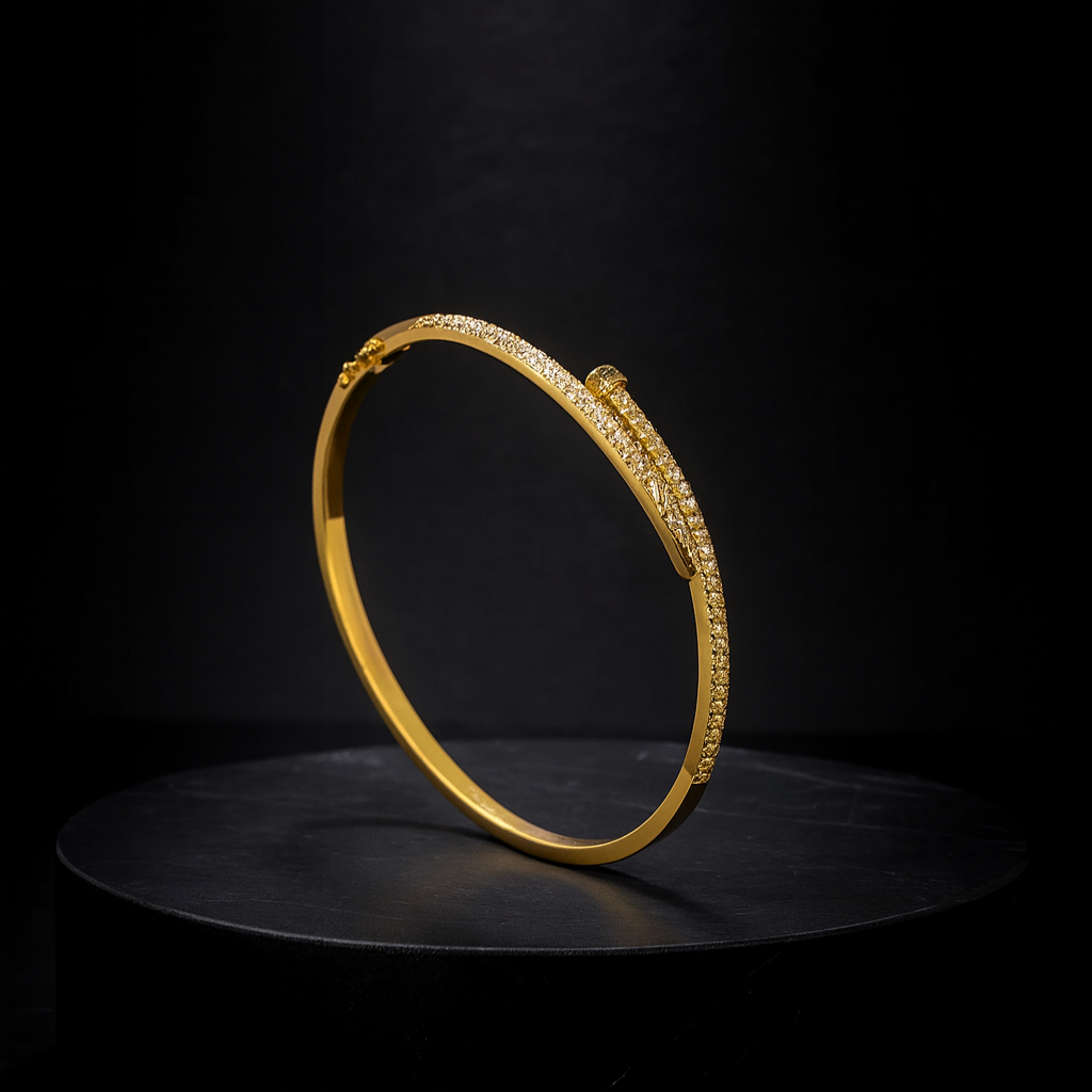 Una pieza que refleja tu carácter fuerte y tu brillo único. Esta pulsera representa resistencia, determinación y la belleza de lo simple. La silueta de clavo, reconocida por su estilo moderno, se viste de oro laminado 18K y circonias para una estética única.